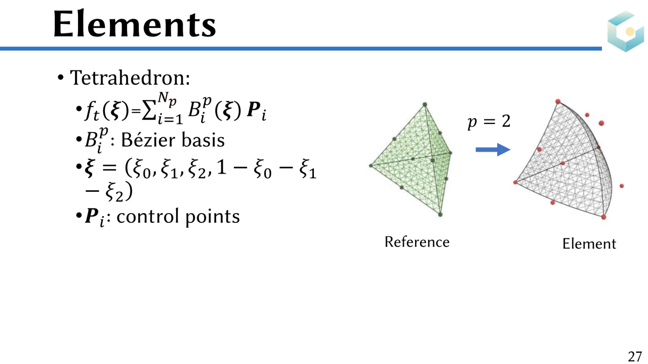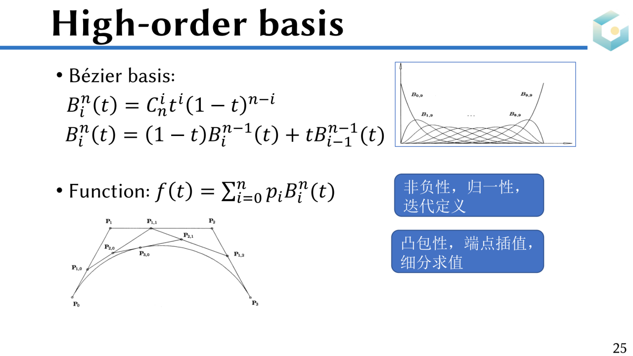 使用高阶网格时需要使用高阶的基函数来表示几何。对于多项式基函数,最常见的形式是Bézier基(Bézier basis)。实际上Bézier基等价于Bernstein多项式(Bernstein polynomial),在实际应用中一般会通过递归的方式来进行定义。Bézier基有很多优良的数学性质,包括非负性、归一性、凸包性以及端点插值等。利用Bézier基的递归定义可以方便地实现细分求值。