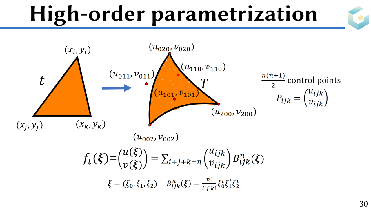 具体来说我们需要把一个已知的一阶三角形单元\(t\)转换为高阶三角形单元\(T\),此时需要引入额外的控制点。