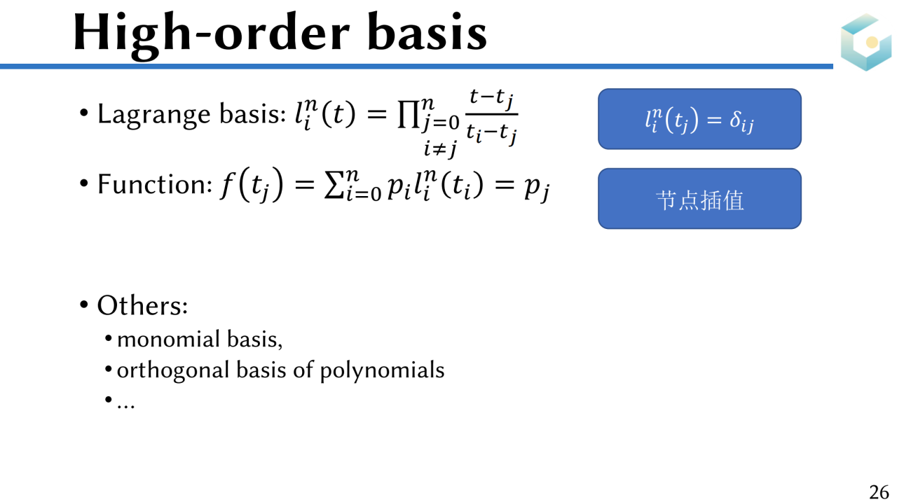 另一种常见的多项式基是Lagrange基(Lagrange basis),它的特点在于基函数仅在指定的节点上为1而在其他位置为0。其他常用的基函数包括幂基(monomial basis)、正交多项式基(orthogonal basis of polynomials)等,当然这些多项式基都张成了多项式函数空间,可以通过线性变换来相互转换。