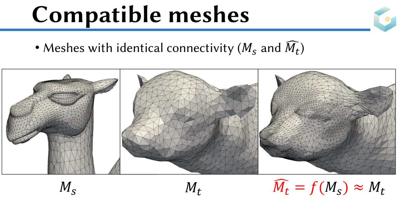 与曲面对应类似的还有相容性网格(compatible mesh),它是指具有相同连接关系(拓扑)的两个网格。利用曲面对应技术我们可以把一个网格映射到另一个网格上,映射前后的网格构成了一对相容性网格。