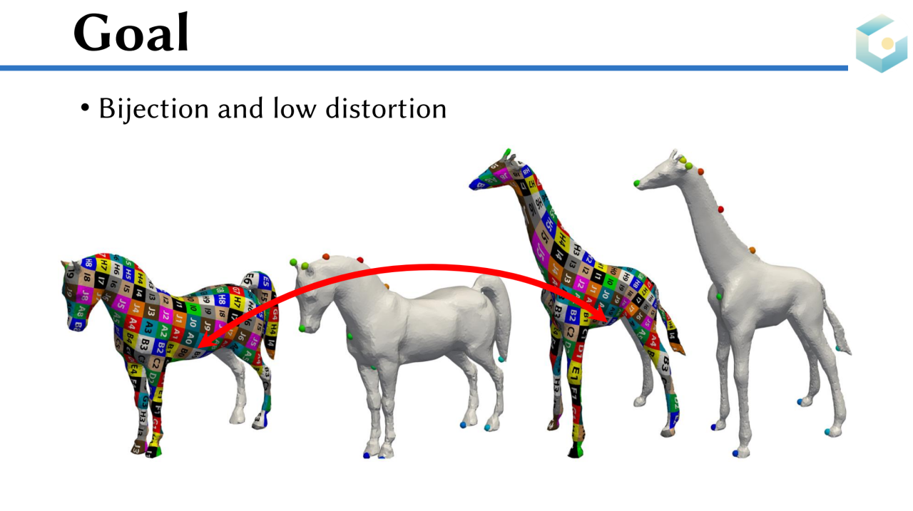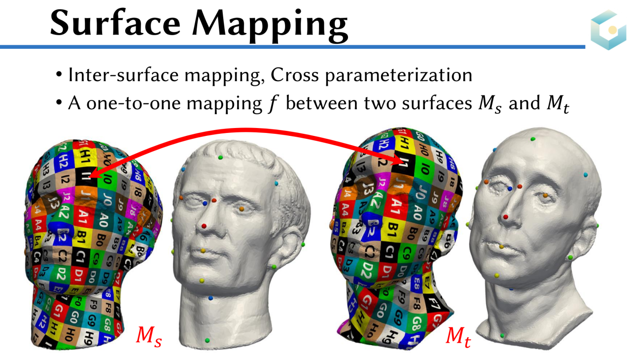 曲面对应(inter-surface mapping)的目标是建立两个曲面之间的一一映射关系。对于三角形网格来说,我们希望这样的映射关系不仅仅只是针对顶点的,还要考虑面到面以及边到边的对应关系。