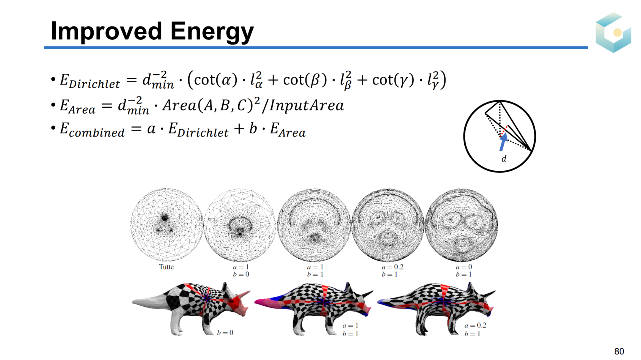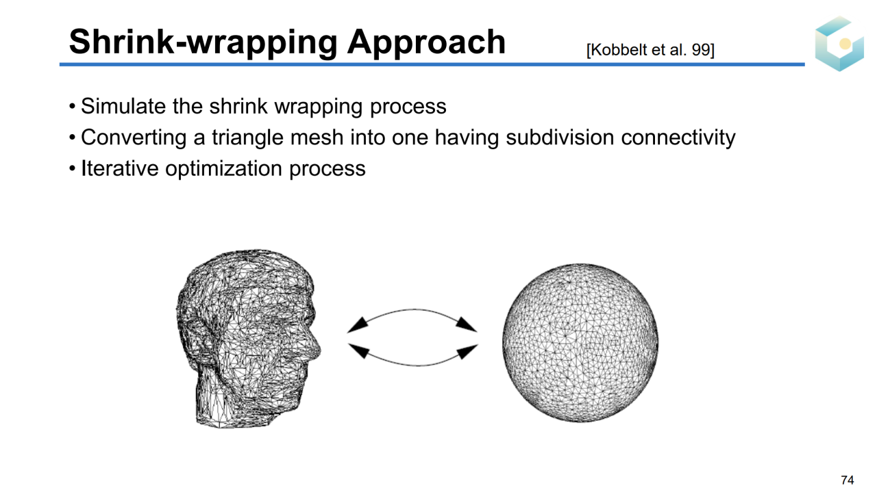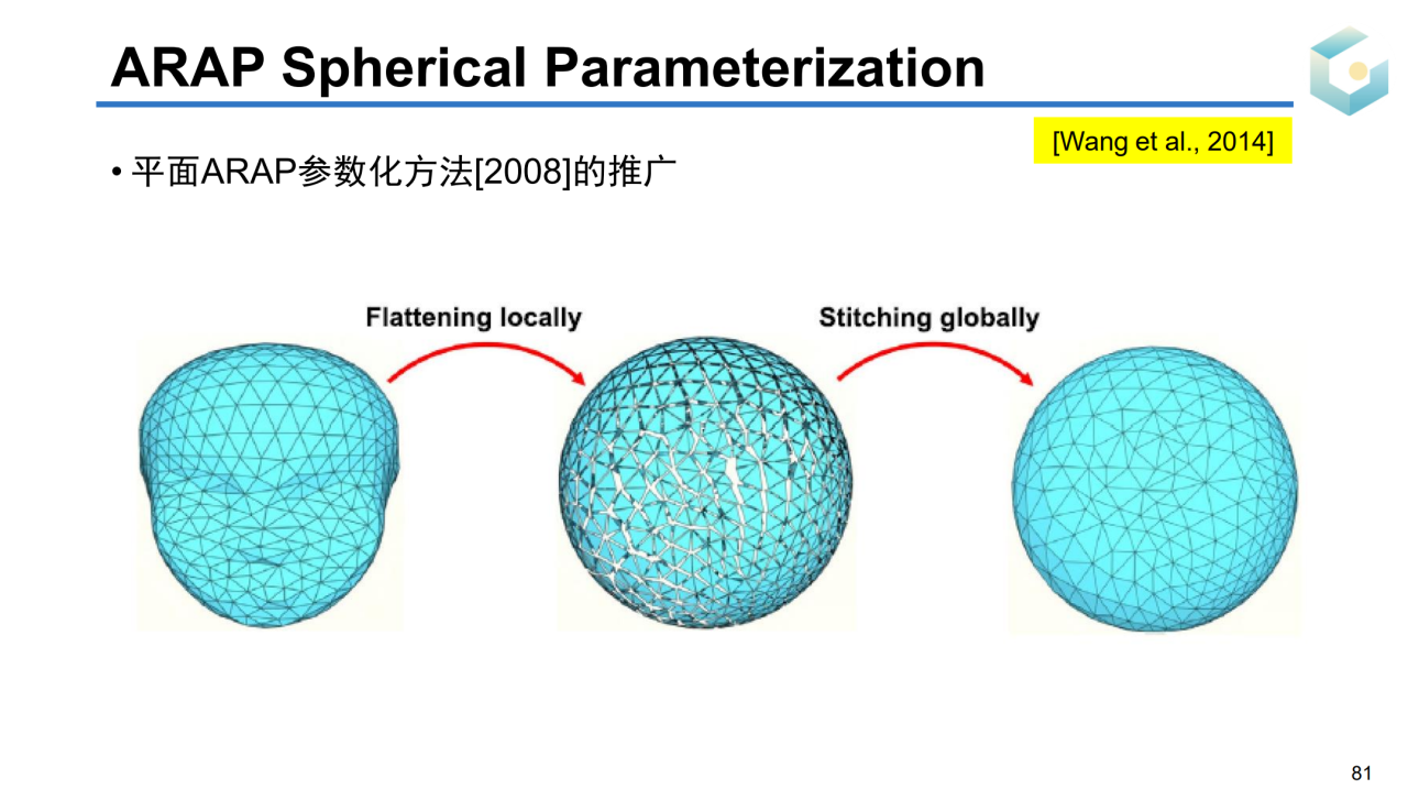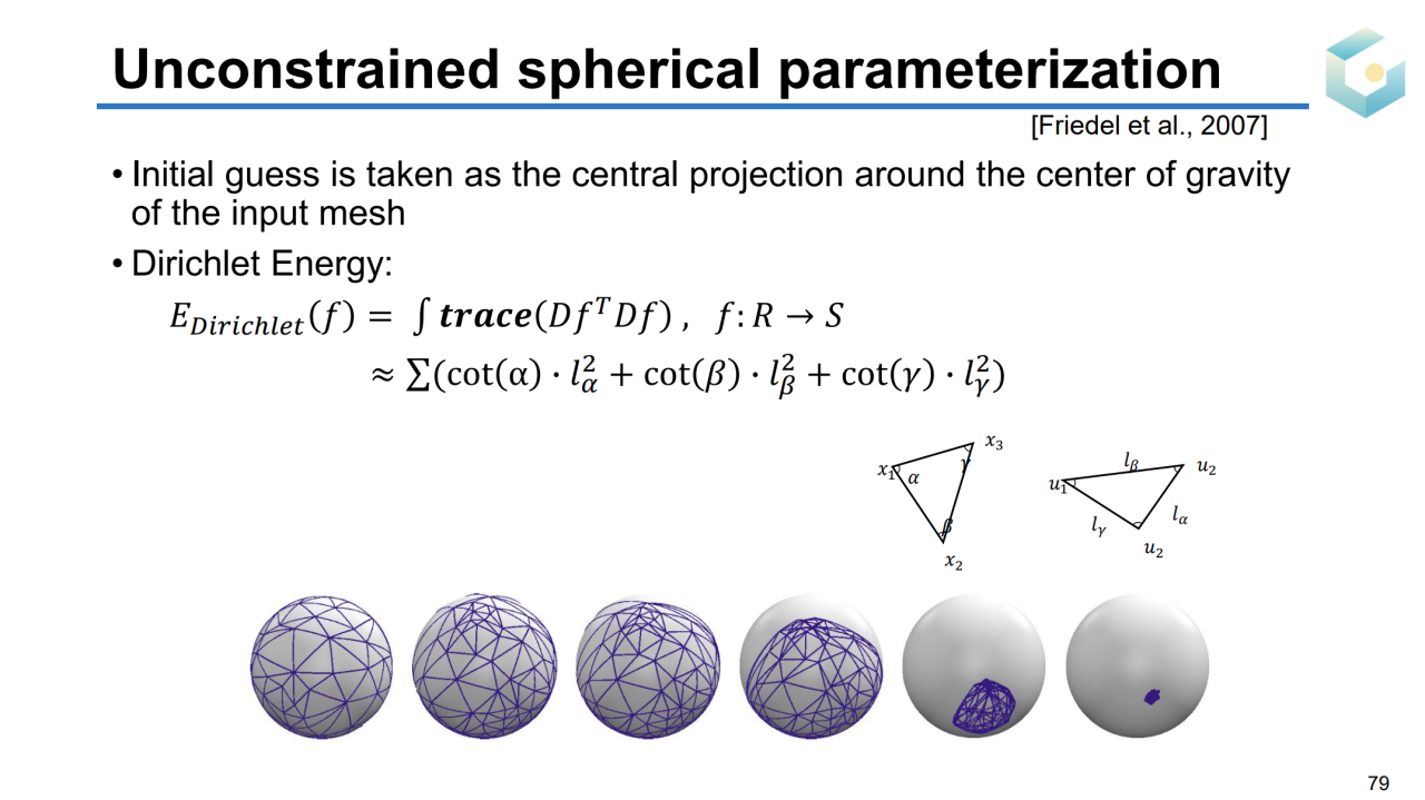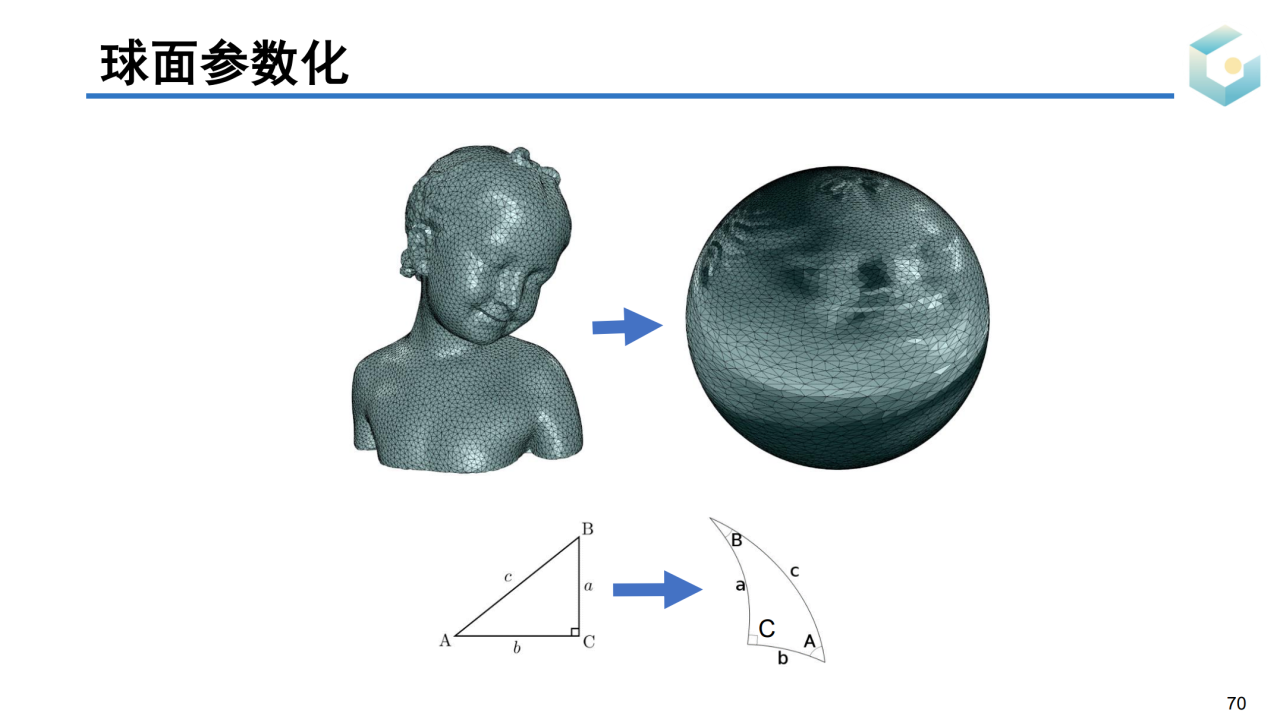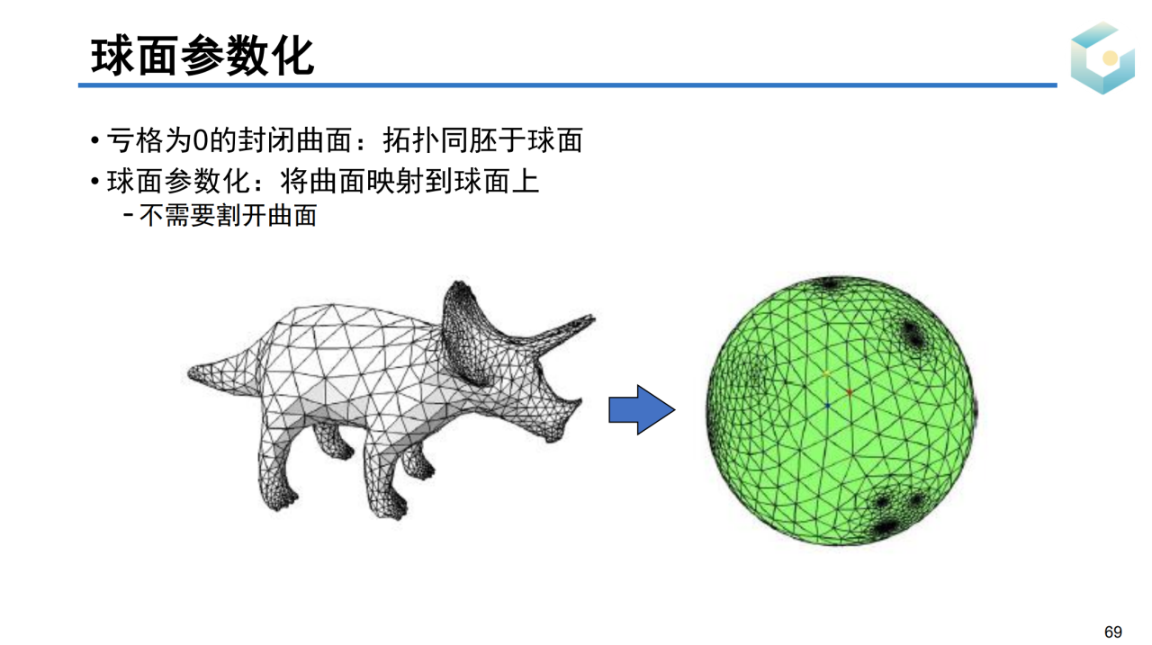 但实际上我们并不需要将封闭曲面参数化到平面上。对于亏格为0的封闭曲面,其拓扑同胚于球面。因此我们可以把这样的曲面参数化到一个球面上,这样的过程称为球面参数化(spherical parameterization)。