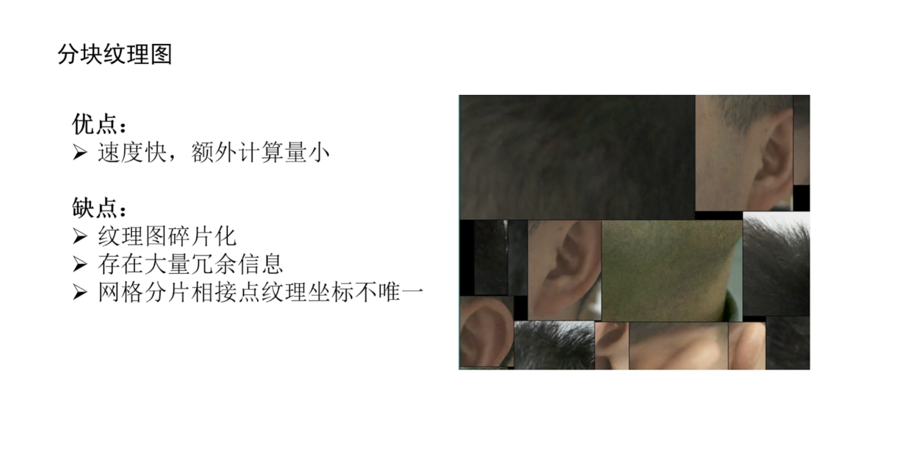 这种分块纹理图的保存方式易于实现,而且在计算上也比较简单。但其缺陷在于整个纹理图的碎片化,同时纹理图上也有着大量的冗余信息,更严重的是网格分片的交界处会出现纹理坐标不唯一的问题。