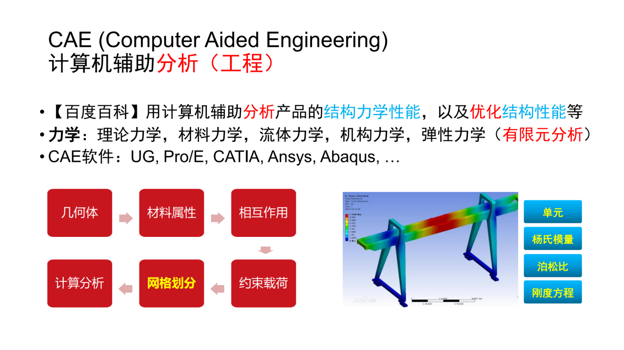 与CAD类似的还有计算机辅助工程(computer aided engineering, CAE),在CAE中我们更关心产品的各种力学性能从而优化构件设计。