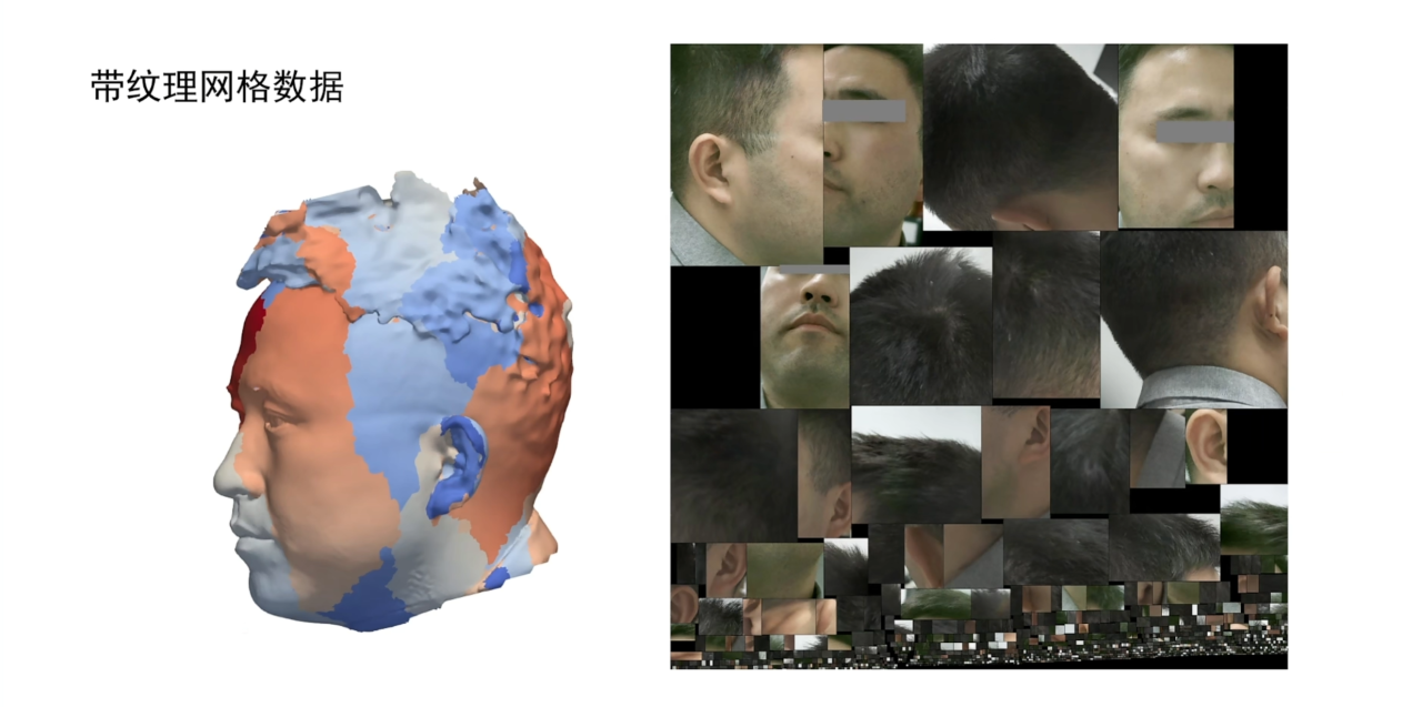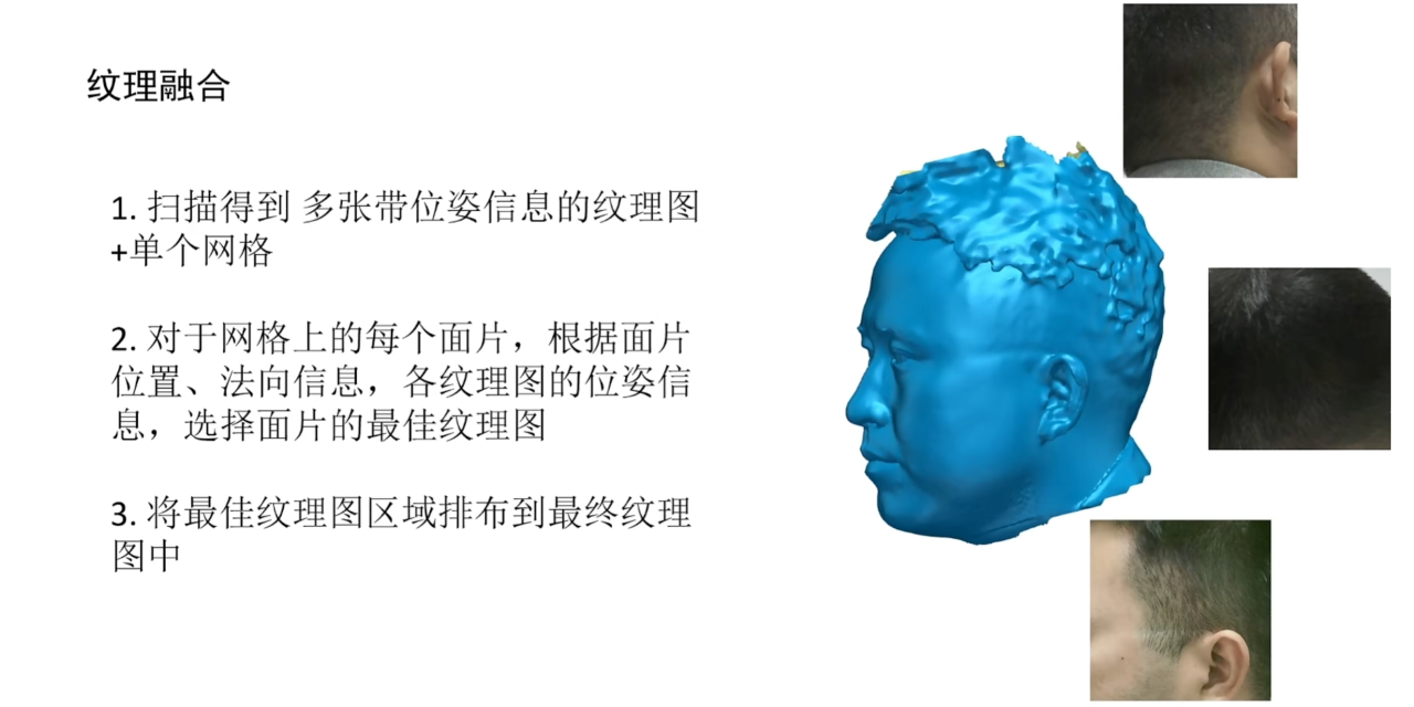 三维扫描仪一般会有专门的纹理相机来收集不同位姿下物体的纹理图像,这样当我们重建完网格后就可以根据网格上每个面片的位置和法向等信息来选择合适的纹理,最后把整个网格的纹理信息排布到纹理图上。