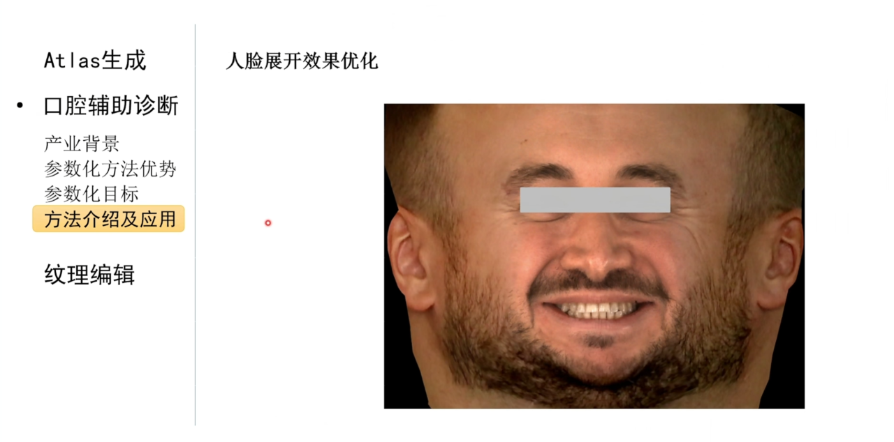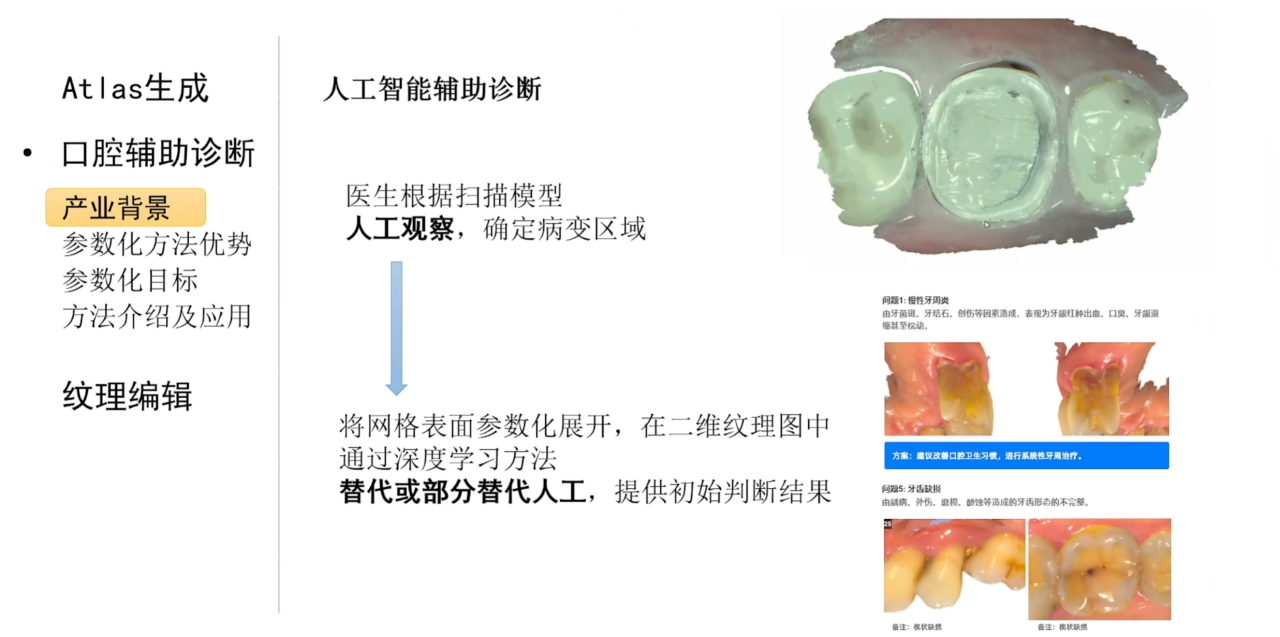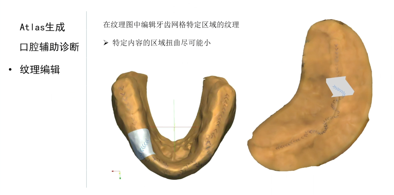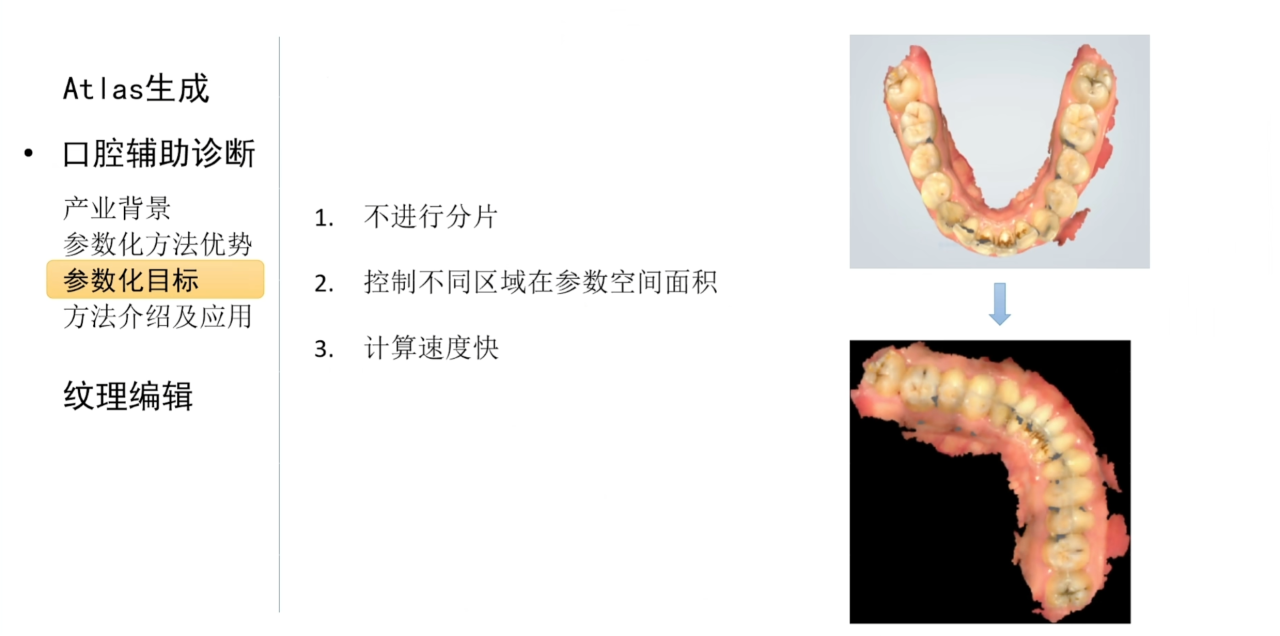 而结合参数化技术我们还可以把患者的牙齿展开到二维平面上,并且结合人工智能技术在二维纹理图像上进行自动诊断。对于这种应用场景,我们希望参数化算法可以不对网格进行分片,同时可以控制不同区域投影到参数平面上的面积。