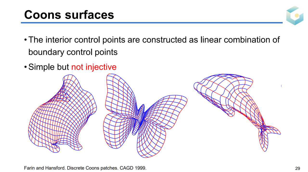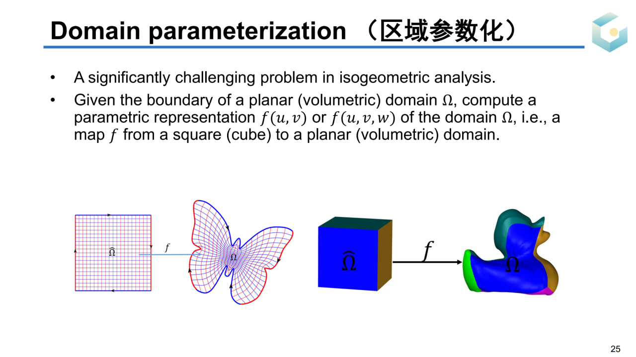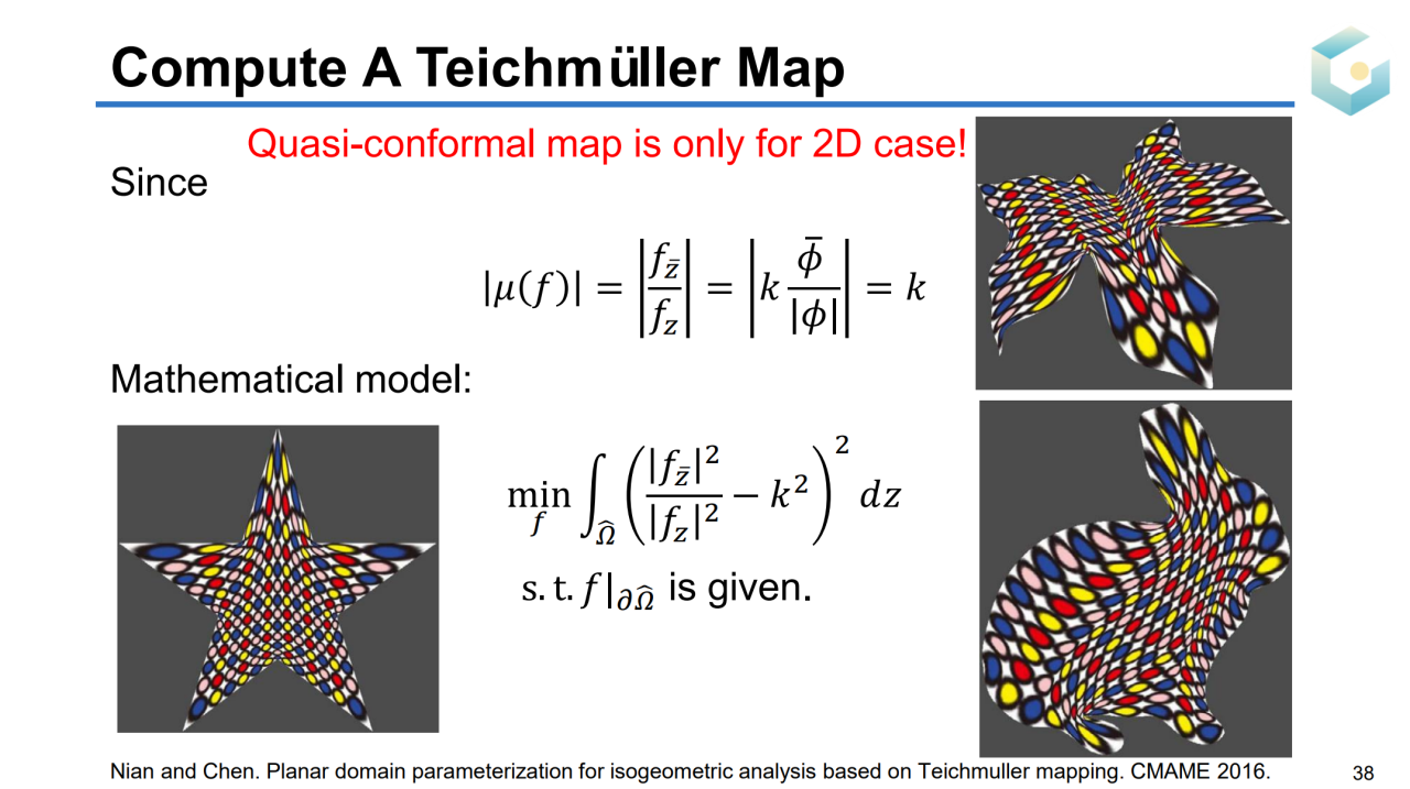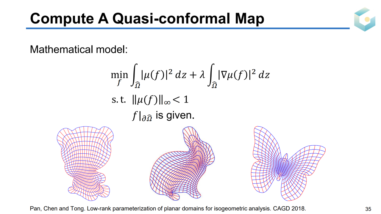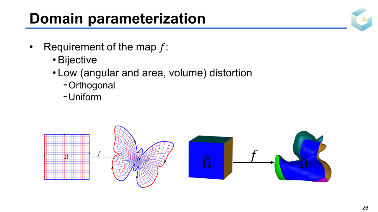 计算映射\(G\)的本质是求解区域参数化(domain parameterization),它的目标是把一个指定图形的边界映射到规范区域上。当然这样的映射需要满足双射、低几何扭曲的条件。