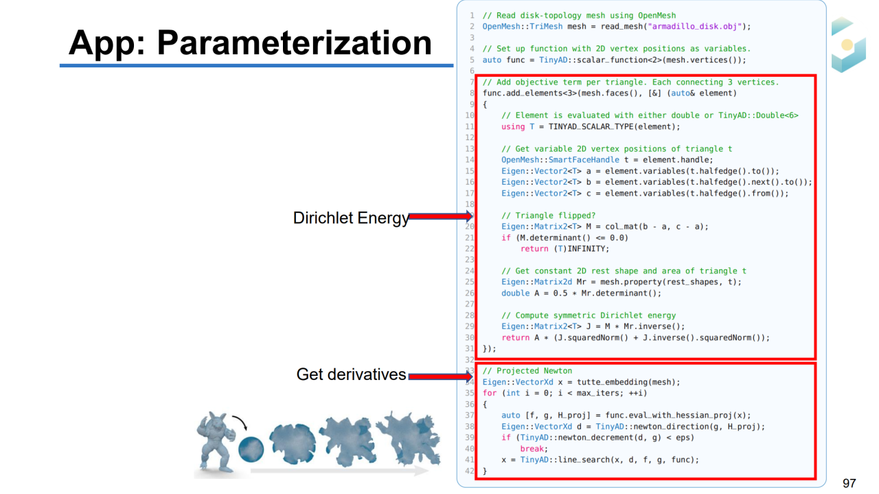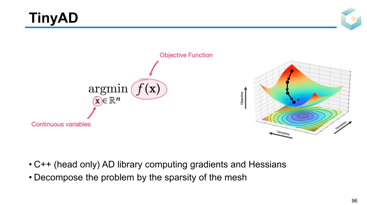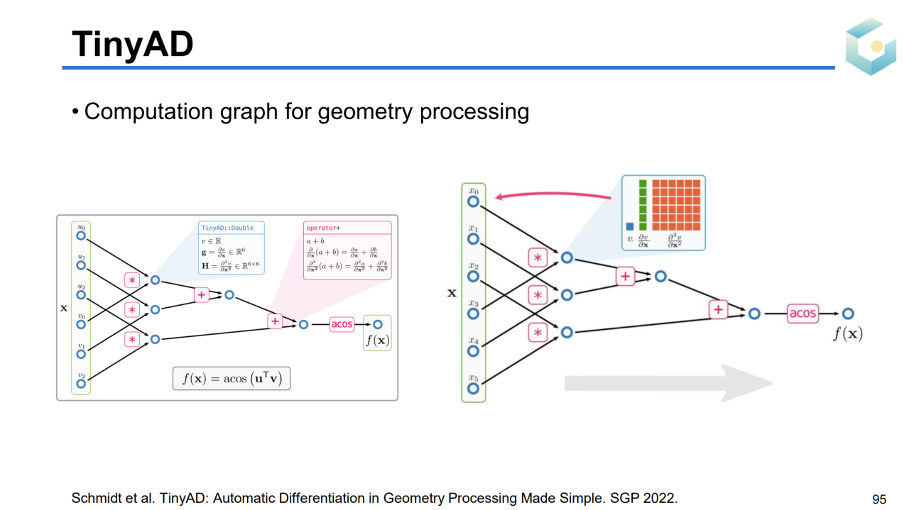 最近基于自动微分框架的几何处理工具也开始在业界流行起来。TinyAD就是这样的一个计算工具,它可以自动推导目标函数的微分并且利用相应的求解器来计算优化。和传统方法相比,基于这样的框架可以非常方便地编写代码,因此得到了相关从业者的广泛关注。