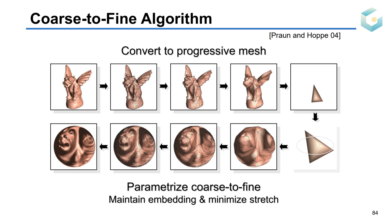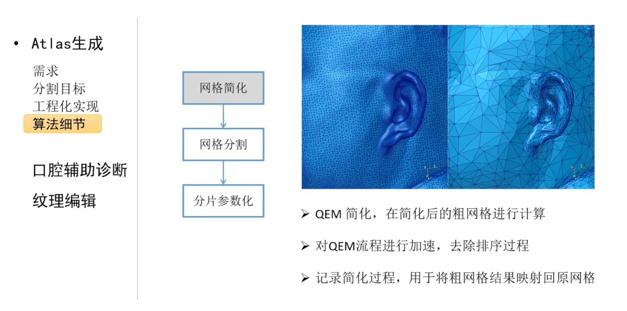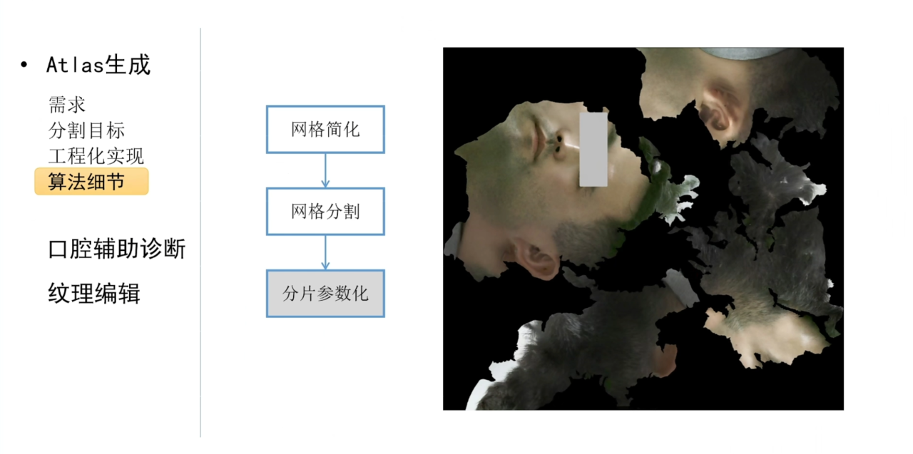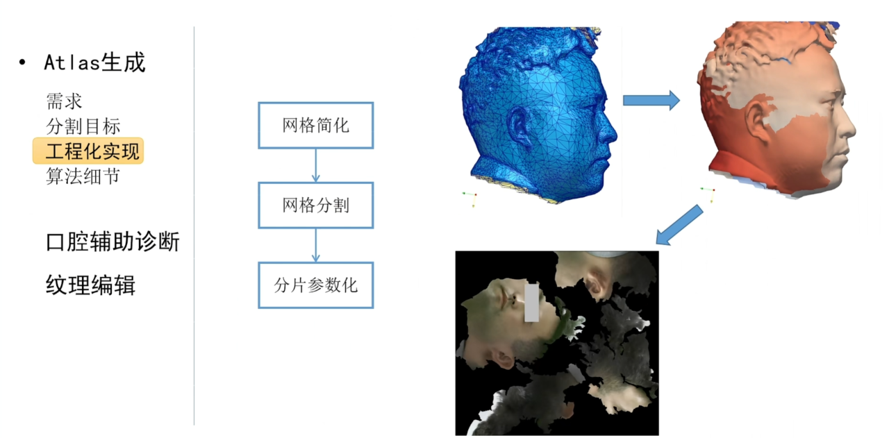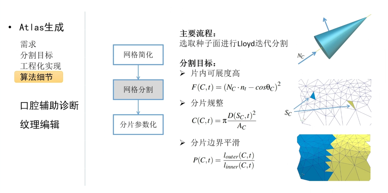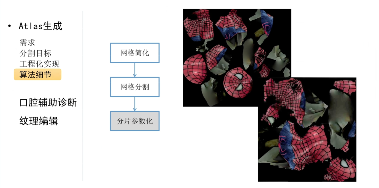 在算法实现方面,一般会先结合网格简化的技术来降低计算复杂度,然后在简化的网格上进行分割以及参数化。