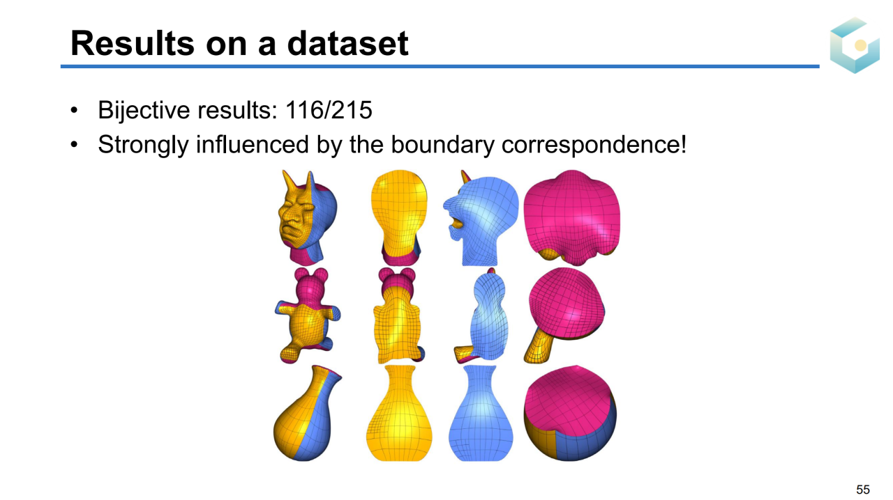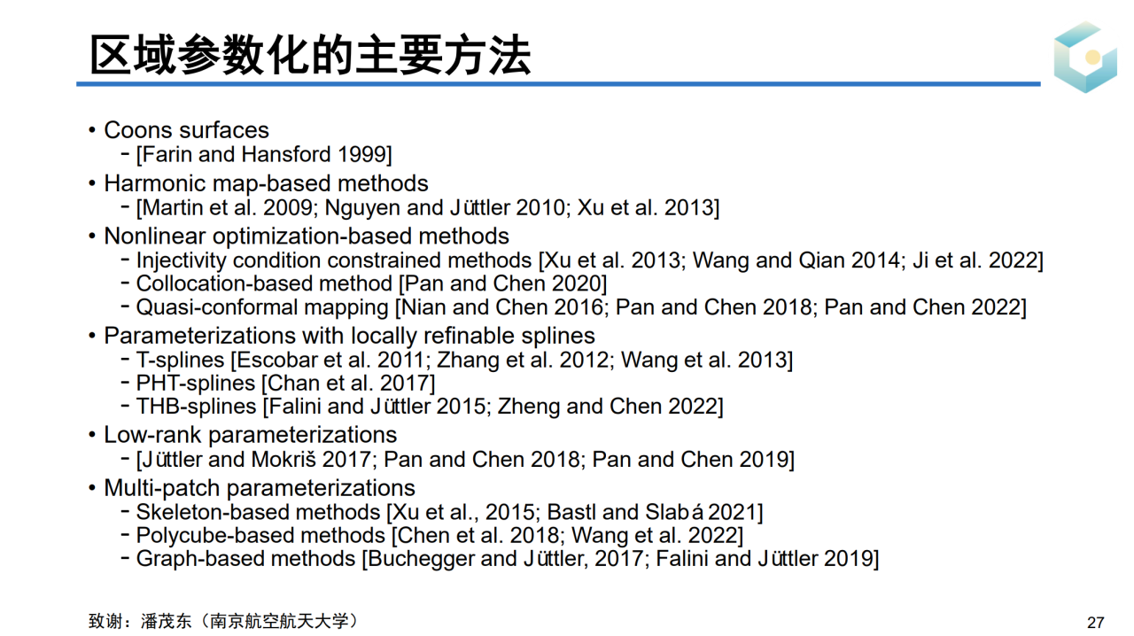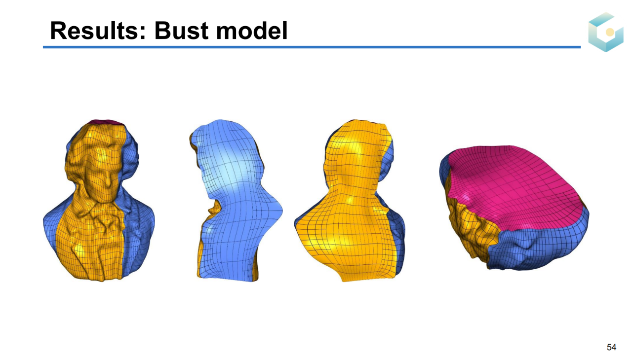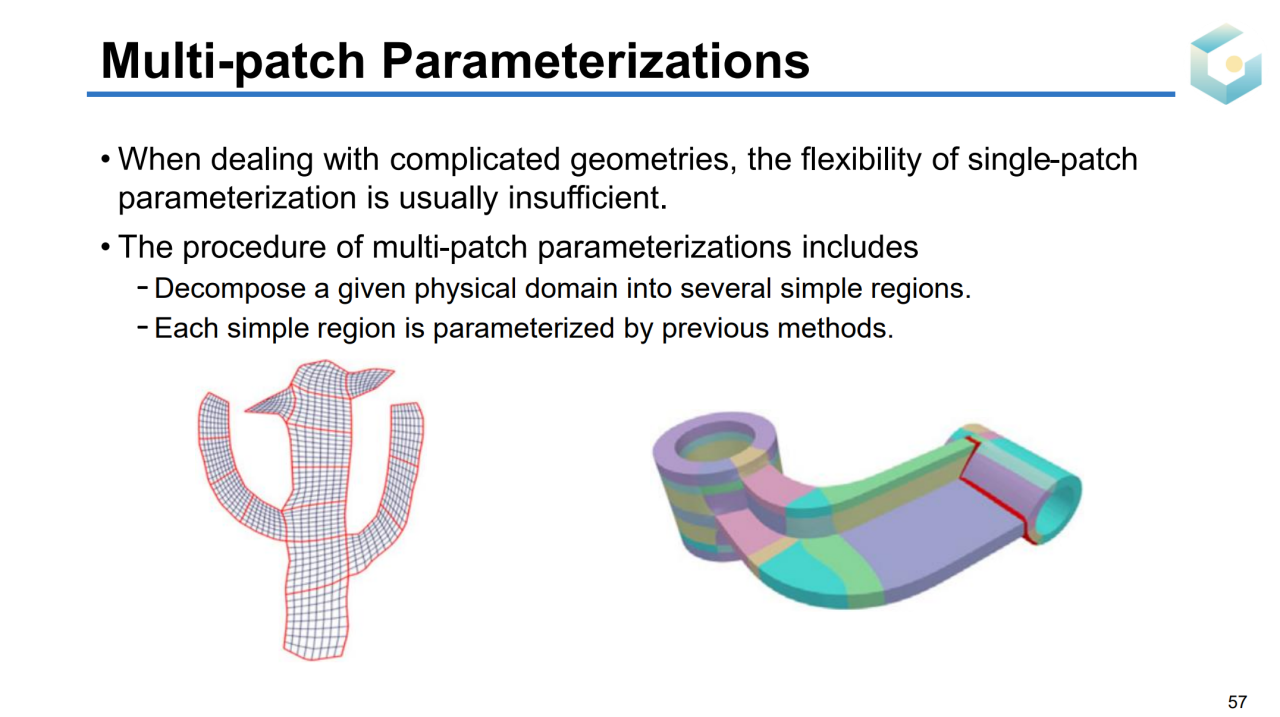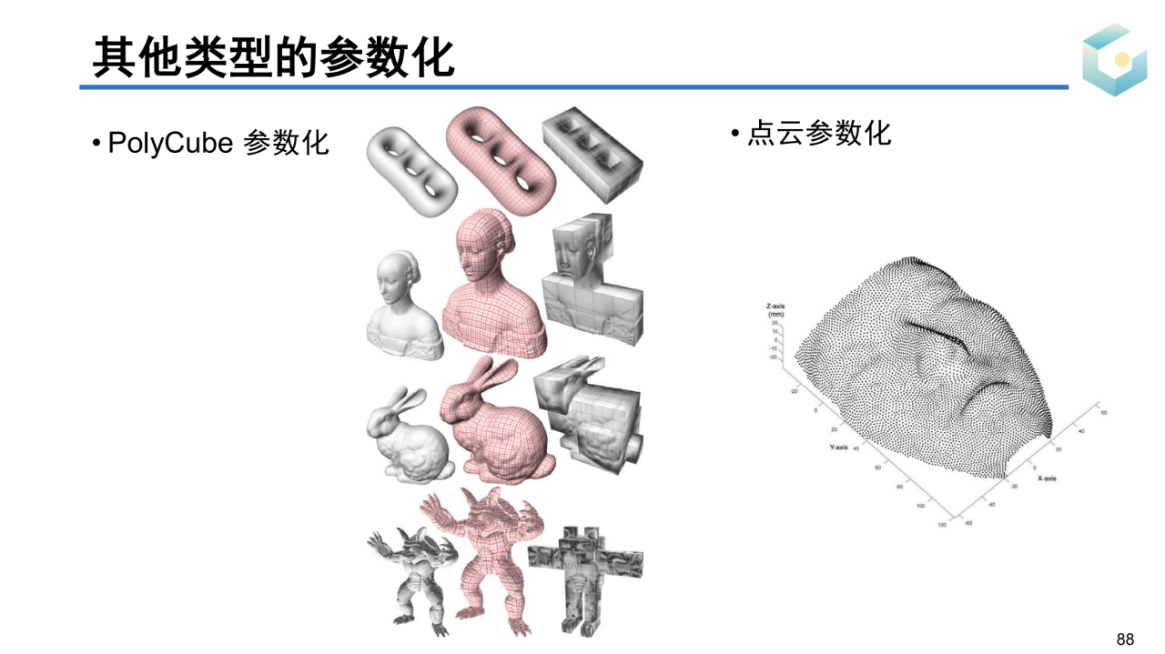 对于一些高亏格的曲面可能很难直接找到合适的目标域,此时可以把曲面参数化到若干个相互连接的长方体上,这种方法称为PolyCube参数化。对于点云这种没有连接关系的数据结构,我们同样可以把它们参数化到平面上。