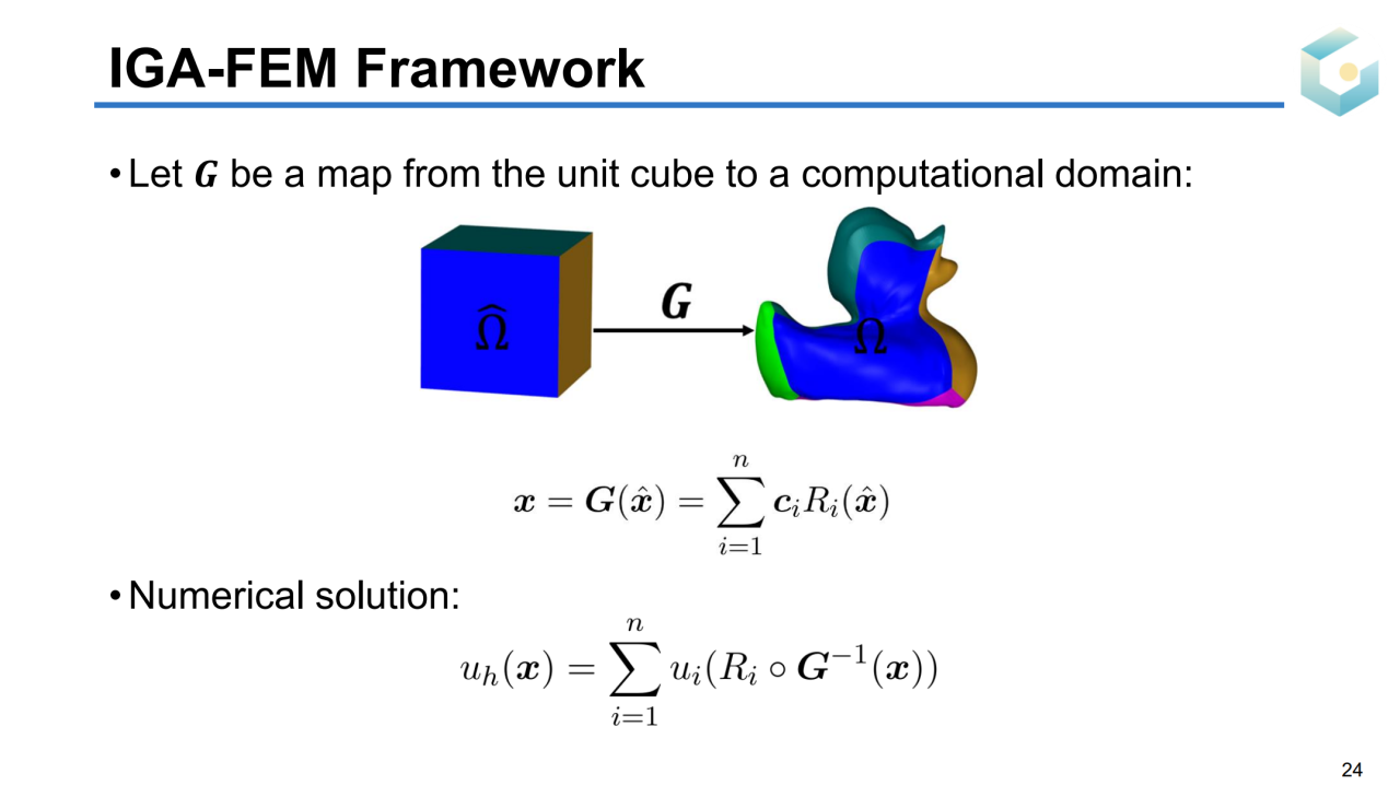 基于IGA的概念,我们可以把FEM的问题转换为先通过映射\(G\)将某个规范域\(\hat{\Omega}\)映射到求解域\(\Omega\)上,然后在\(\Omega\)上求解所需的PDE。