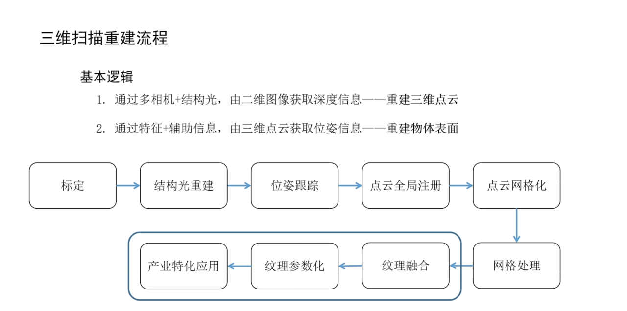 从算法流程上来讲,三维扫描重建需要进行标定、结构光重建、位姿跟踪、点云注册以及点云网格化等步骤来获得网格模型,然后通过网格处理、纹理融合、纹理参数化等步骤来获得高精度模型。在本节课中我们主要介绍纹理融合以及参数化技术在其中的应用。