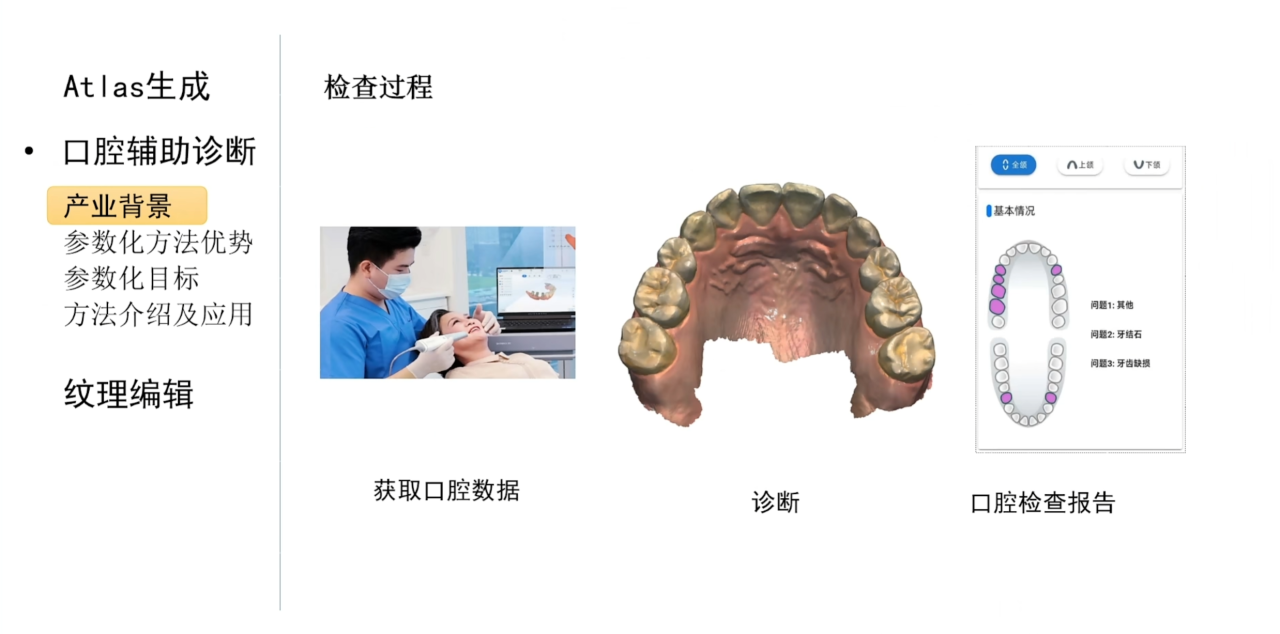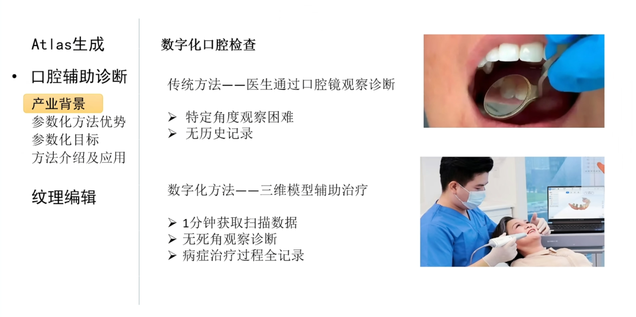 在应用层面,目前三维扫描技术在口腔诊断中有着广阔的前景。和传统通过口腔镜进行诊断相比,三维扫描可以快速地获得患者口腔的三维模型并且可以方便医生无死角地观察患者的病灶,从而加快诊断和治疗的过程。