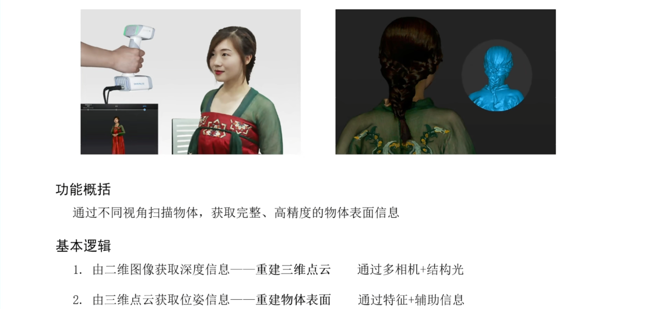 目前三维重建工作可以使用专业的三维扫描仪来完成,它通过不同视角的扫描结果来重建高精度的物体表面信息。其扫描过程的基本逻辑包括由二维图像来获取深度信息重建三维点云,以及从三维点云获取位姿信息重建物体表面两步。