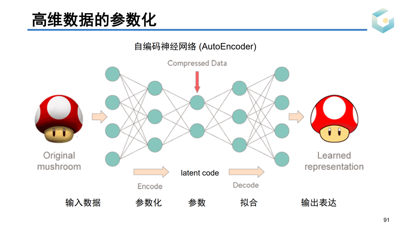 在深度学习中流行的自编码器(auto-encoder)就可以理解为某种参数化过程。输入数据经过编码器降维到某个隐空间(latent space)上,然后在通过解码器升维来恢复原来的信息。这两个步骤可以分别看做是参数化和拟合的过程。