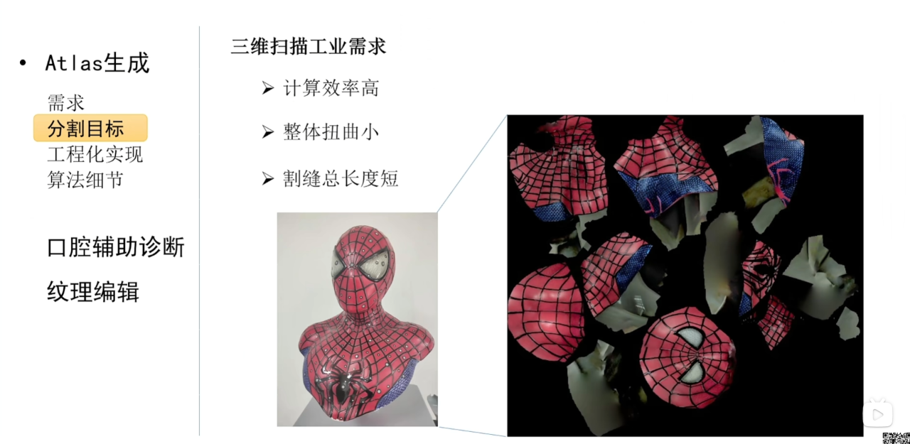 在三维重建中我们希望atlas生成的计算效率尽可能高,同时参数化的结果要有比较小的扭曲而且切割模型的割缝要尽可能短。