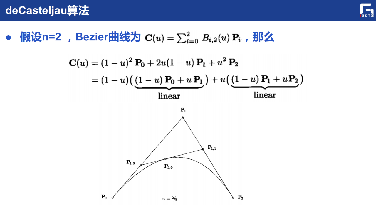 利用Bernstein基函数的递归定义,我们可以得到经典的de Casteljau算法。假设我们有三个控制点\(\mathbf{P}_0\)、\(\mathbf{P}_1\)和\(\mathbf{P}_2\),我们先对线段\(\mathbf{P}_0\mathbf{P}_1\)和\(\mathbf{P}_1\mathbf{P}_2\)进行剖分得到新的控制点\(\mathbf{P}_{1,0}\)和\(\mathbf{P}_{1,1}\),然后再对线段\(\mathbf{P}_{1,0}\mathbf{P}_{1,1}\)进行插值即可得到曲线点的坐标。