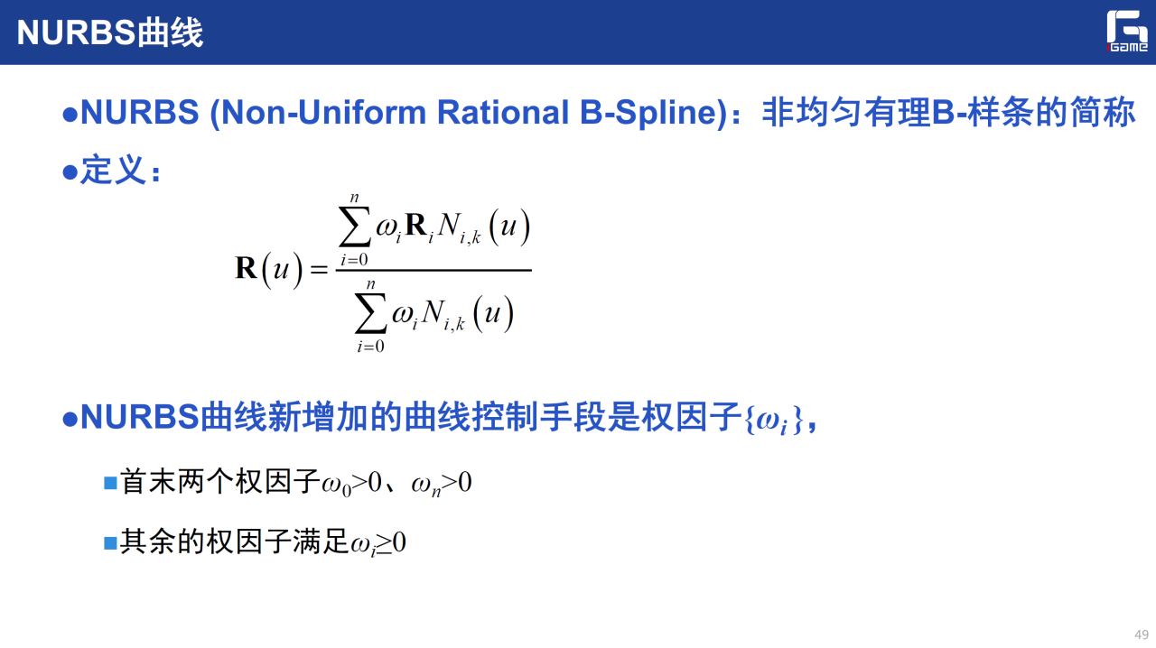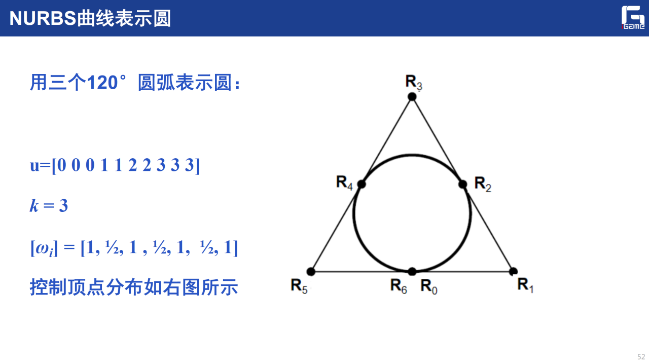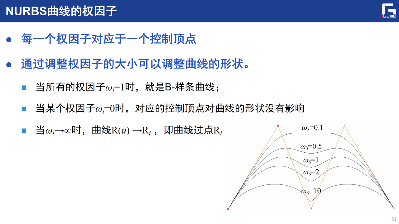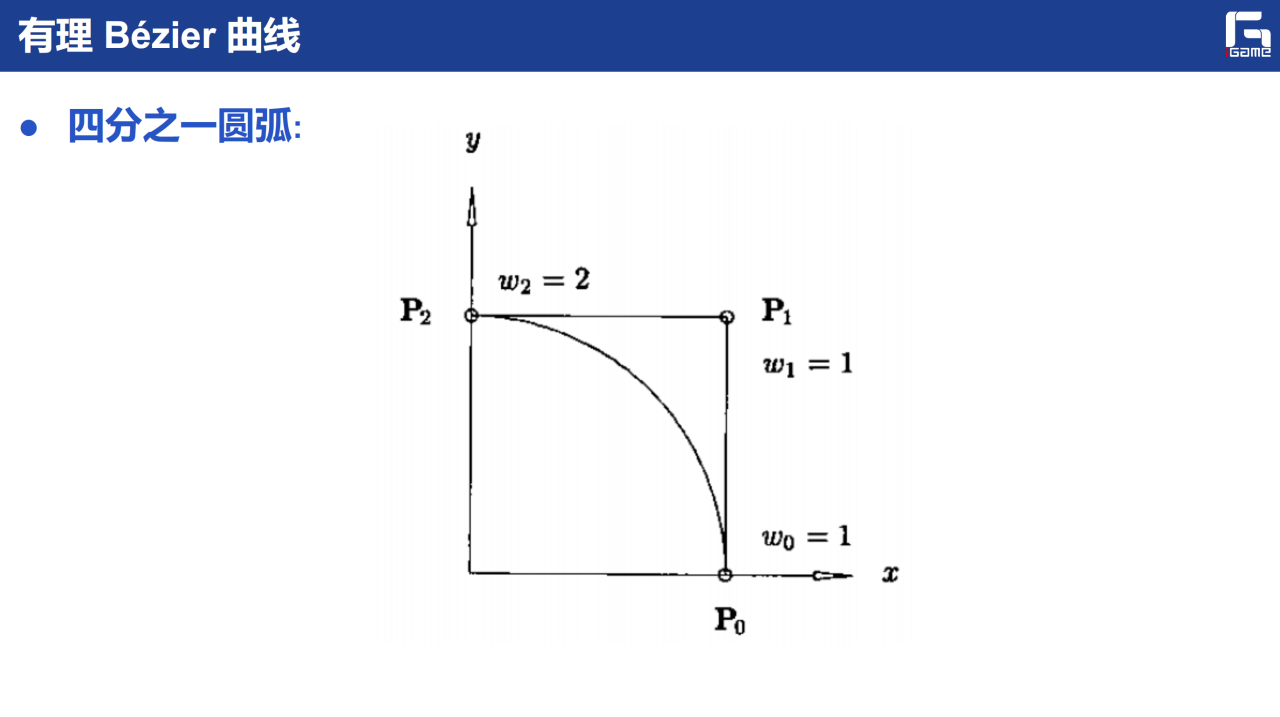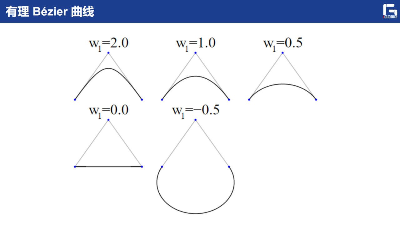 在此基础上人们开发出了有理Bézier曲线,它在标准Bézier曲线的基础上为每个控制点引入一个权重系数\(w_i\)。