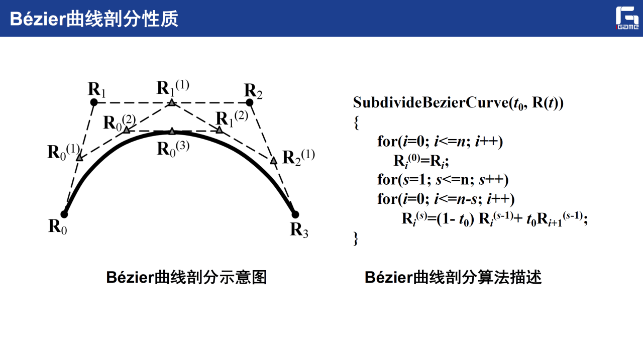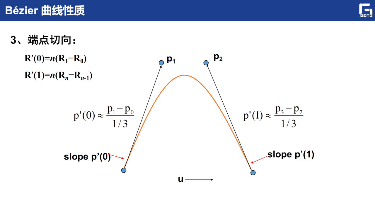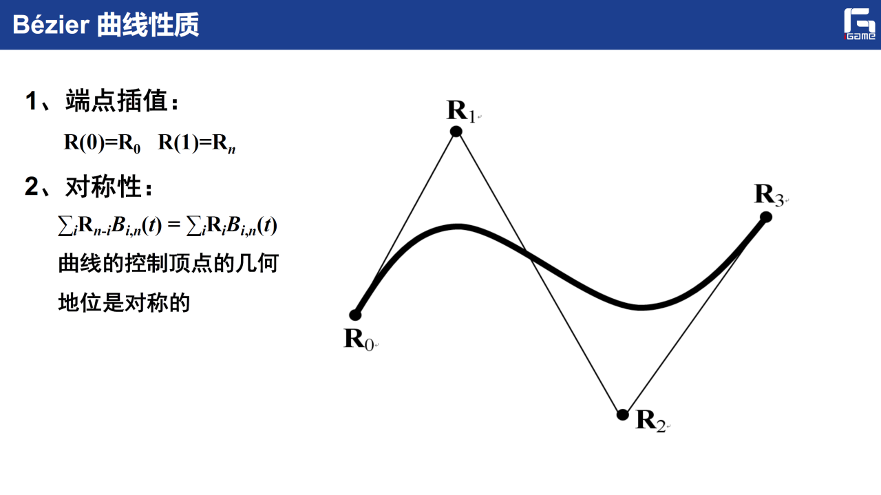 - 端点插值:Bézier曲线一定会通过起始和终止两个端点,\(\mathbf{R}(0) = \mathbf{R}_0\)以及\(\mathbf{R}(1) = \mathbf{R}_n\)