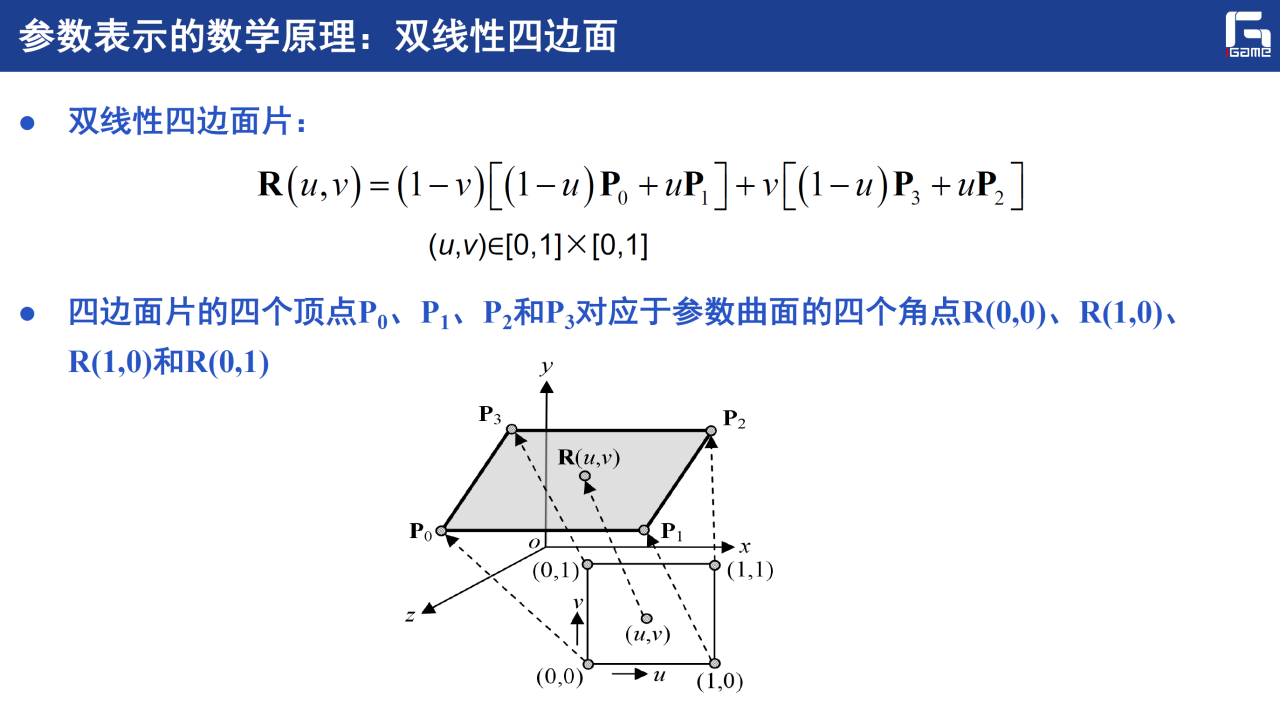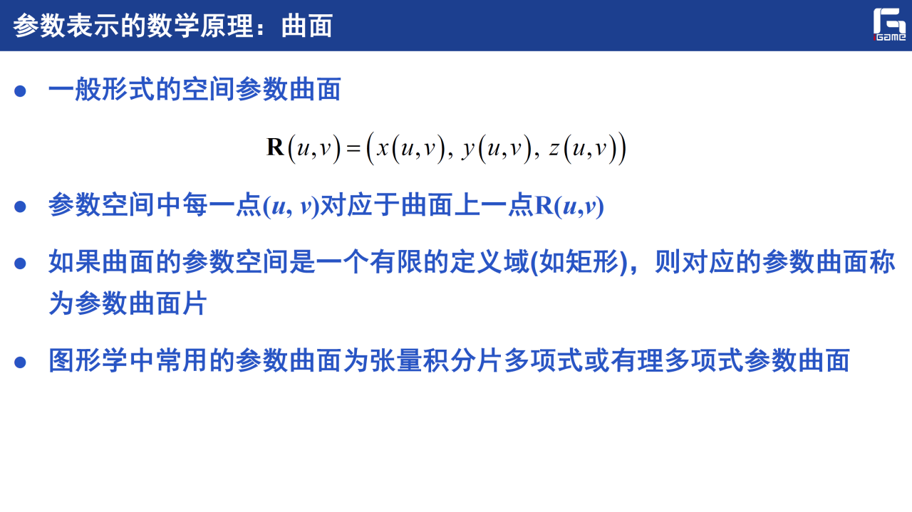 参数曲面的思想与参数曲线类似,对于三维空间曲面上的点我们可以使用二维参数平面进行表示。