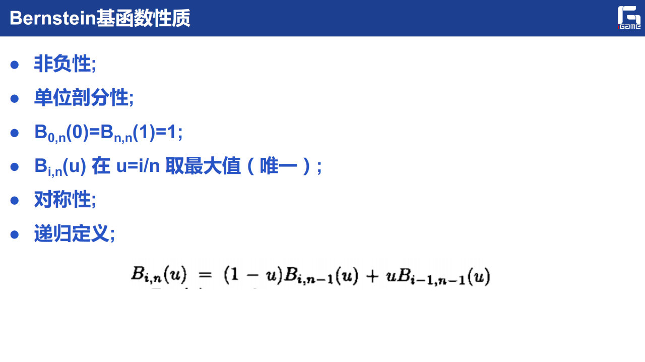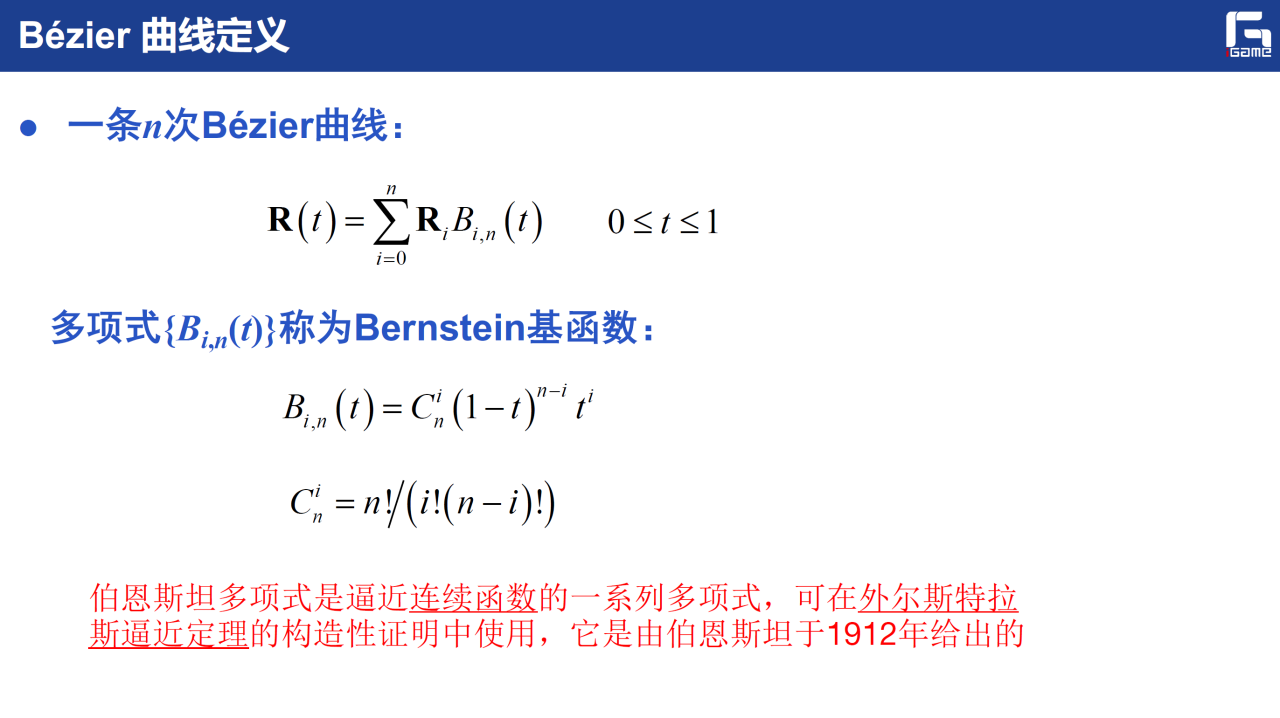 从数学上来看,Bézier曲线是使用Bernstein基来表示的多项式函数。Bernstein基可以使用二项式系数来表达: