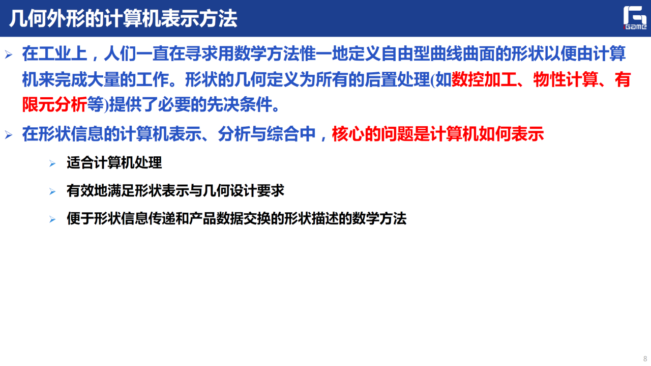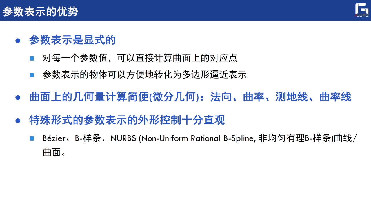 这种参数曲线的表达方法有很多优势,比如说它是非常精确的而且可以解析地计算曲线的各种几何量。本课程主要介绍以Bézier、B-样条、NURBS曲线曲面为代表的参数化建模技术。
