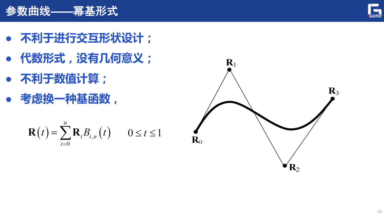 前面介绍的基于多项式的参数曲线非常不直观,不适于数值计算与工程设计。因此对于多项式函数的一种改进方式是使用全新的基函数进行表达:
