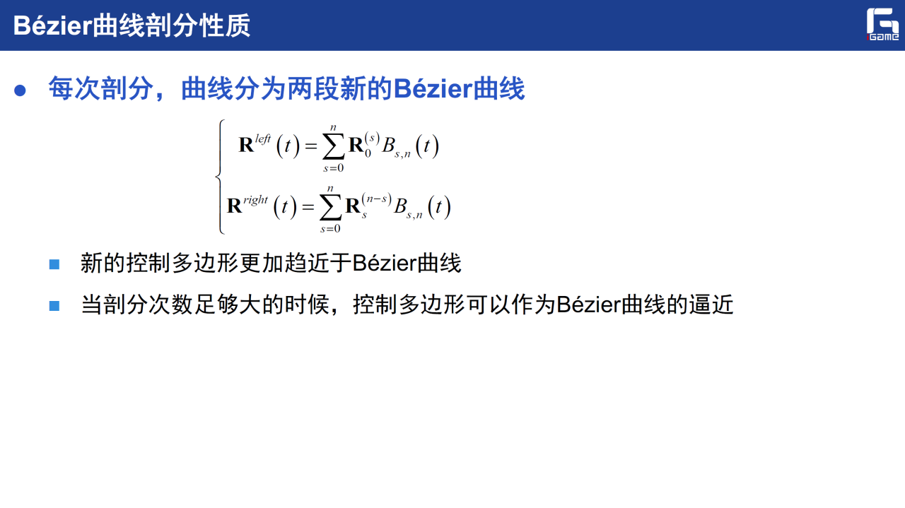 除此之外,当我们计算出曲线上点\(\mathbf{C}(u)\)后该点会把曲线分成左右两部分,它们同样是Bézier曲线。如果我们继续进行剖分,当剖分的次数足够多时得到的新控制点可以作为原始曲线的一个近似。