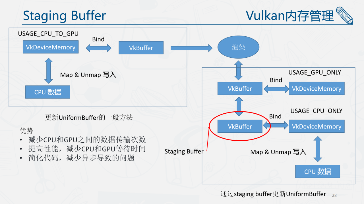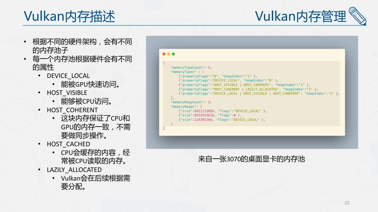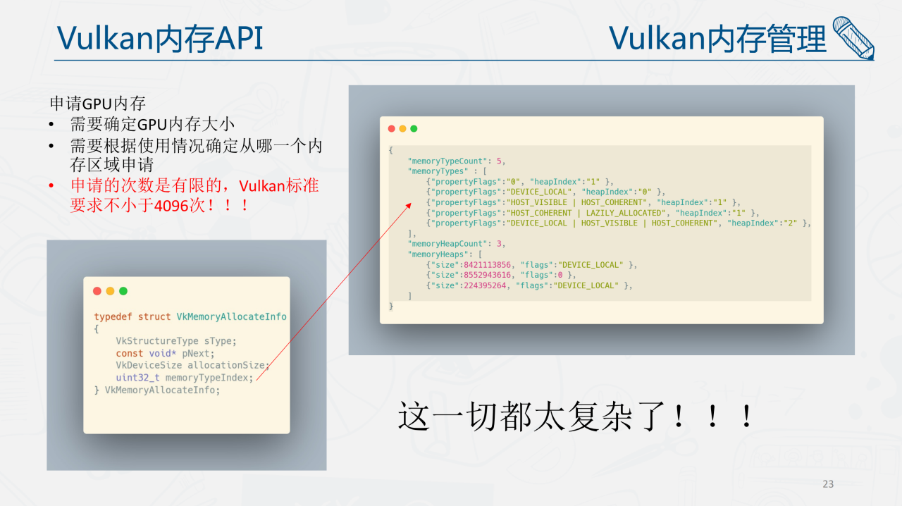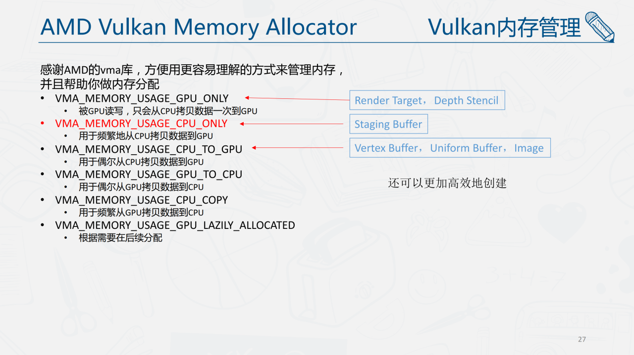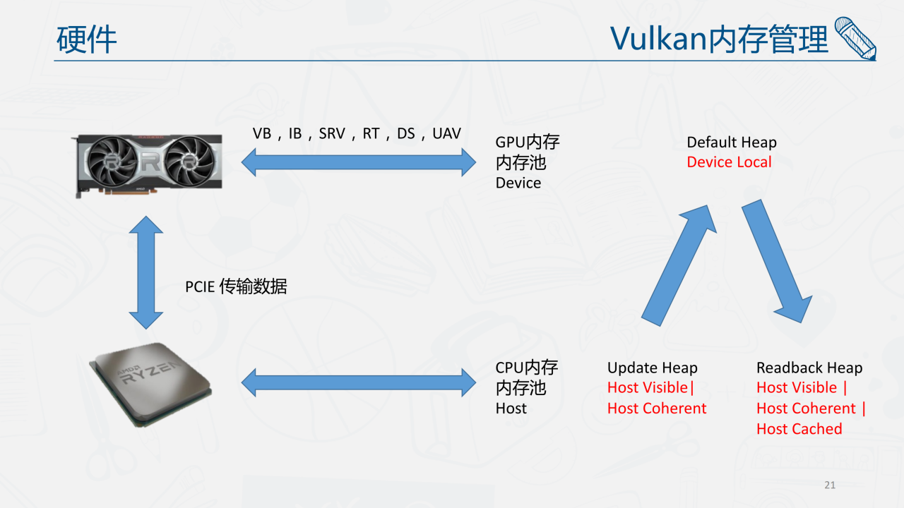 Vulkan在创建对象时可以由用户指定内存分配器来实现手动内存管理。在渲染中我们需要区分CPU和GPU上的内存。