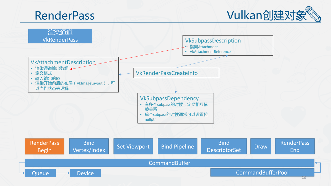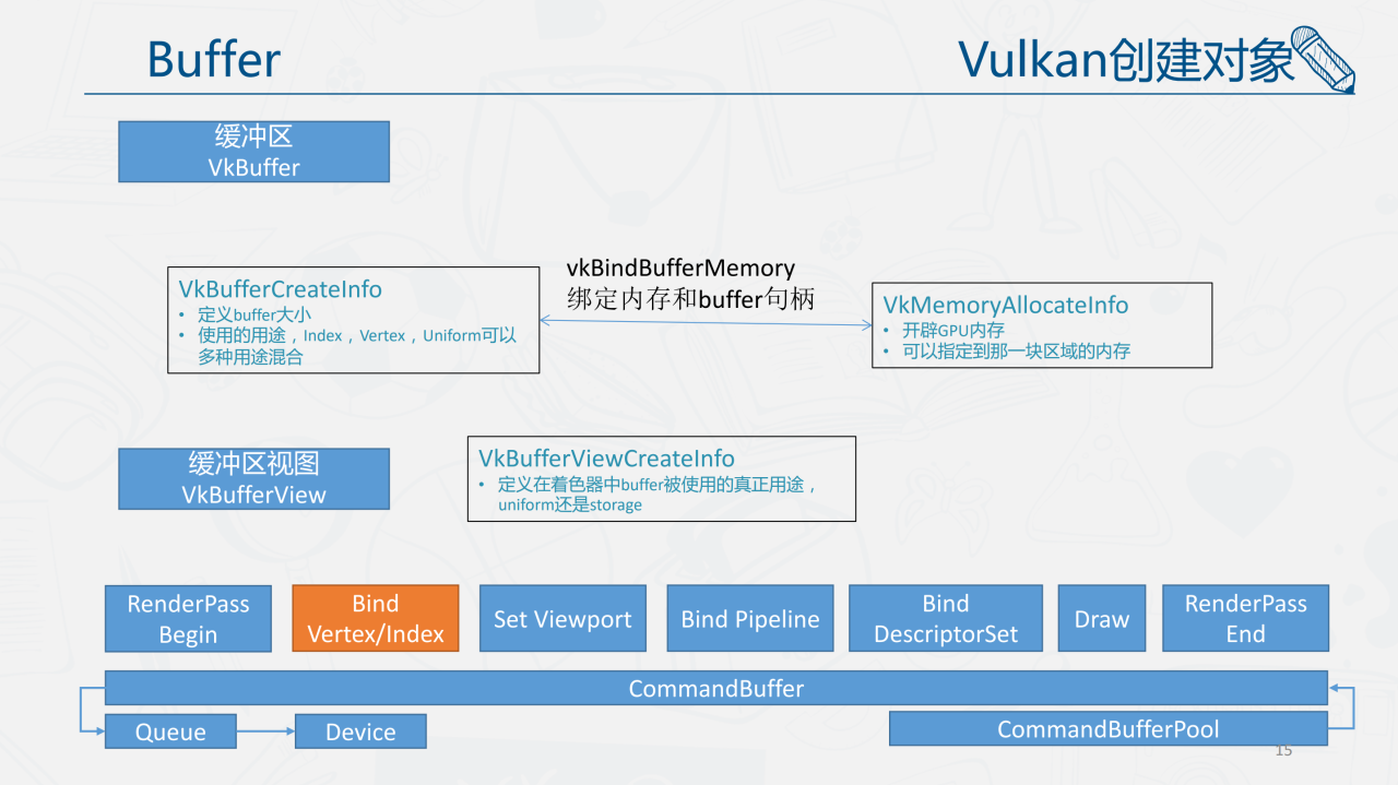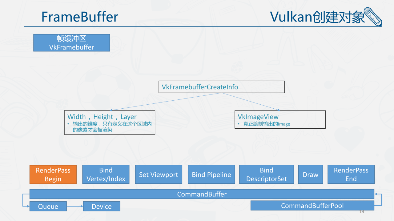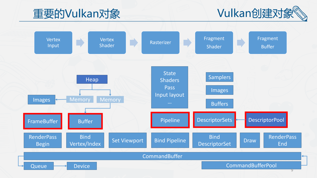 Vulkan中的重要对象包括FrameBuffer、Buffer、Pipeline、DescriptorSets以及DescriptorPool等。