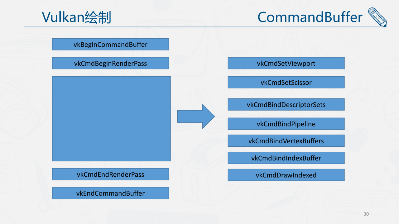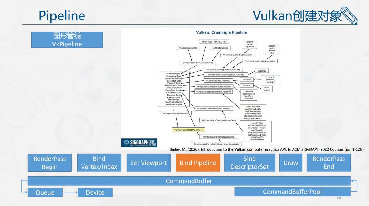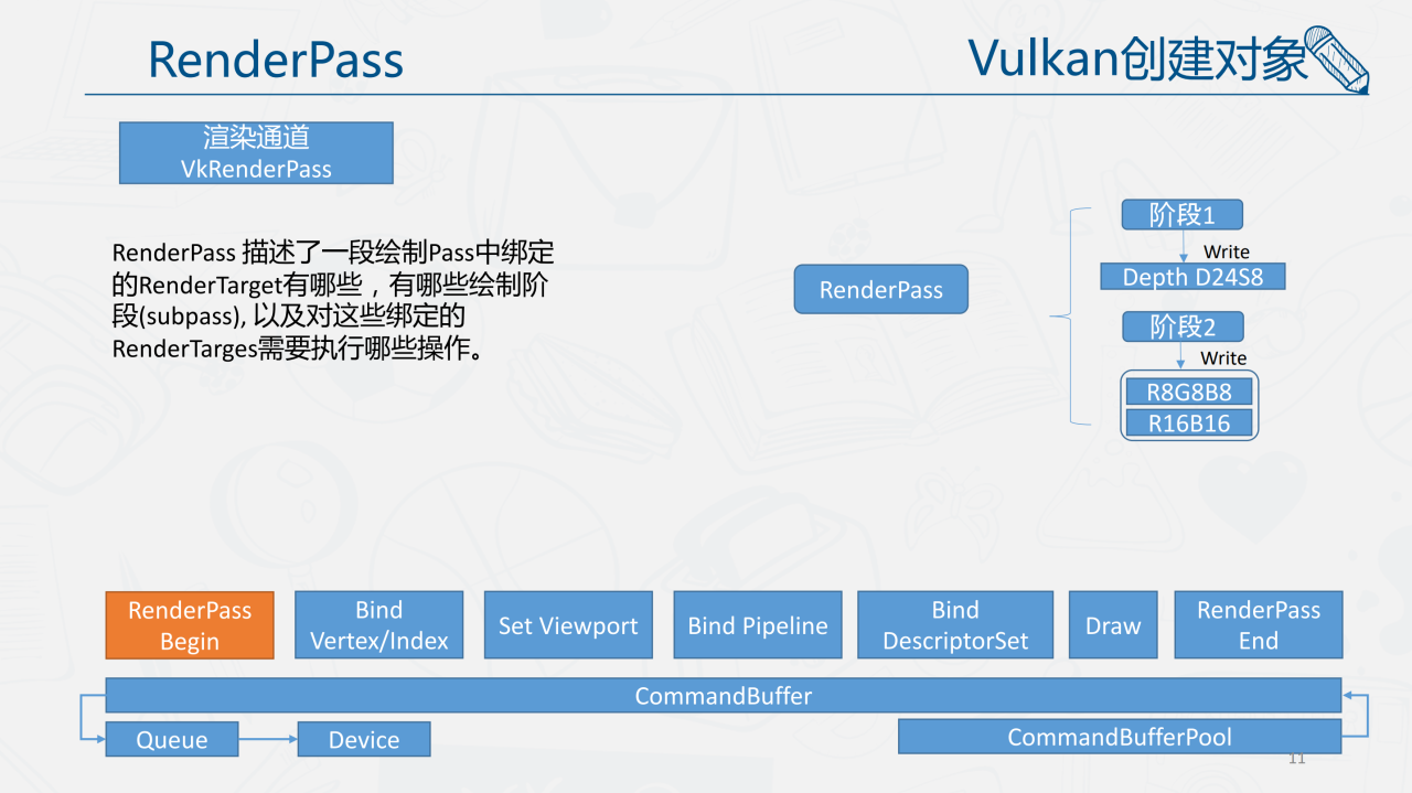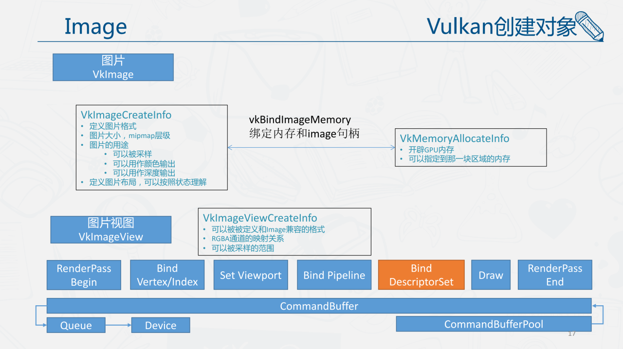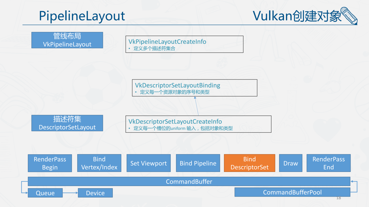 Vulkan中的重要对象包括FrameBuffer、Buffer、Pipeline、DescriptorSets以及DescriptorPool等。