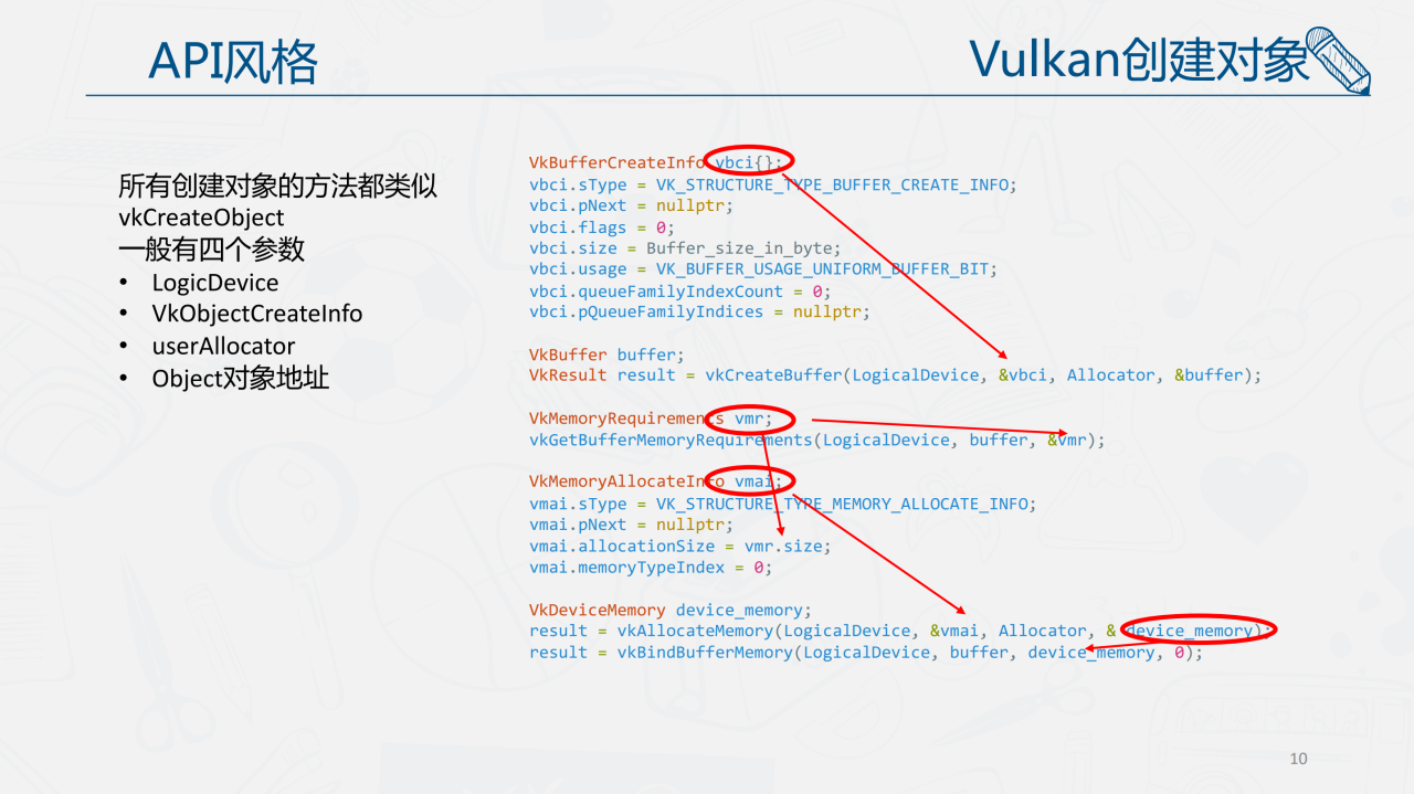 LogicDevice:Vulkan对象的逻辑设备VkObjectCreateInfo:Vulkan对象相关的描述符userAllocator:内存分配器用于内存管理- Object对象地址