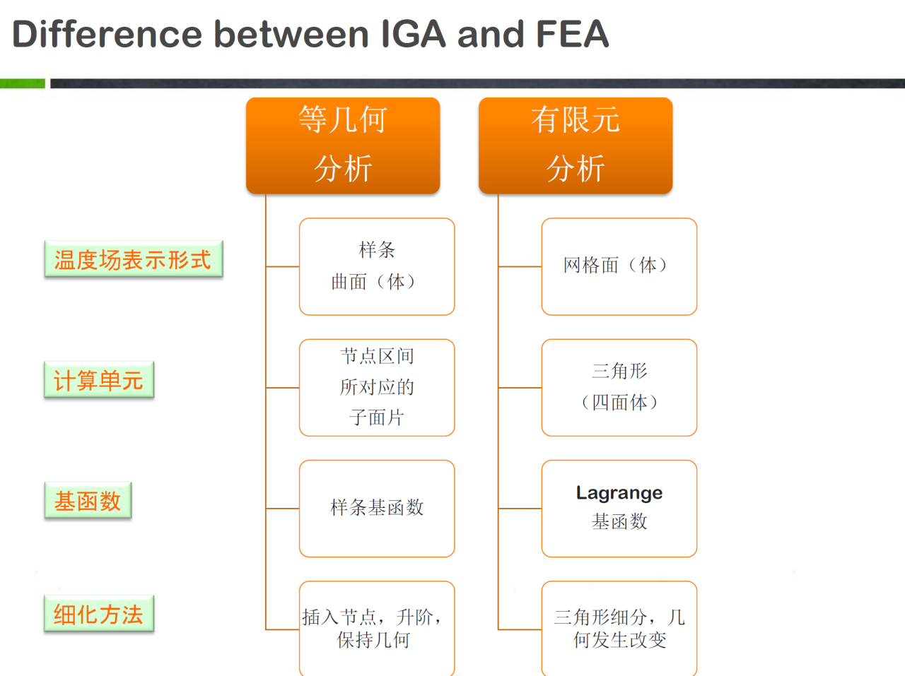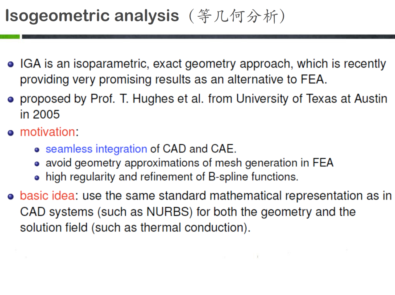 简单比较一下FEA和IGA,IGA的核心思想是使用与几何域一致的样条基作为基函数,这样可以避免很多单元离散导致的问题。